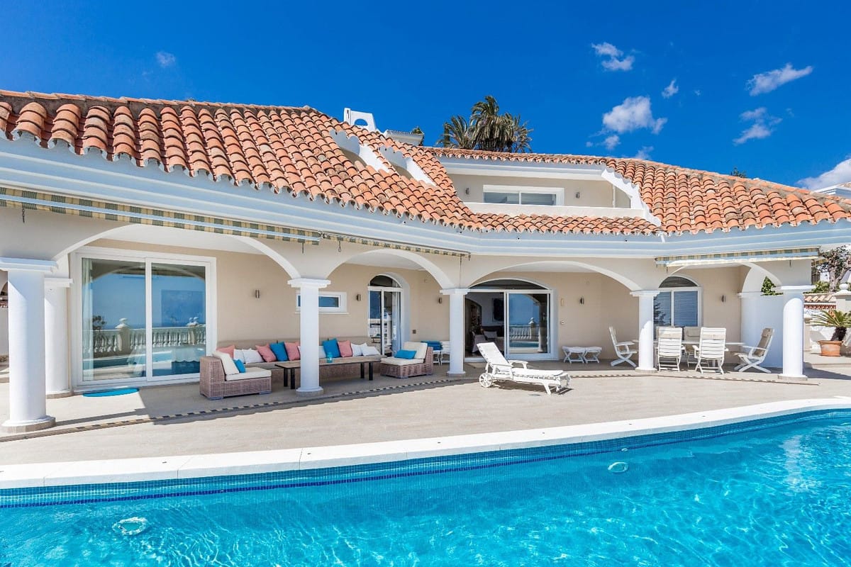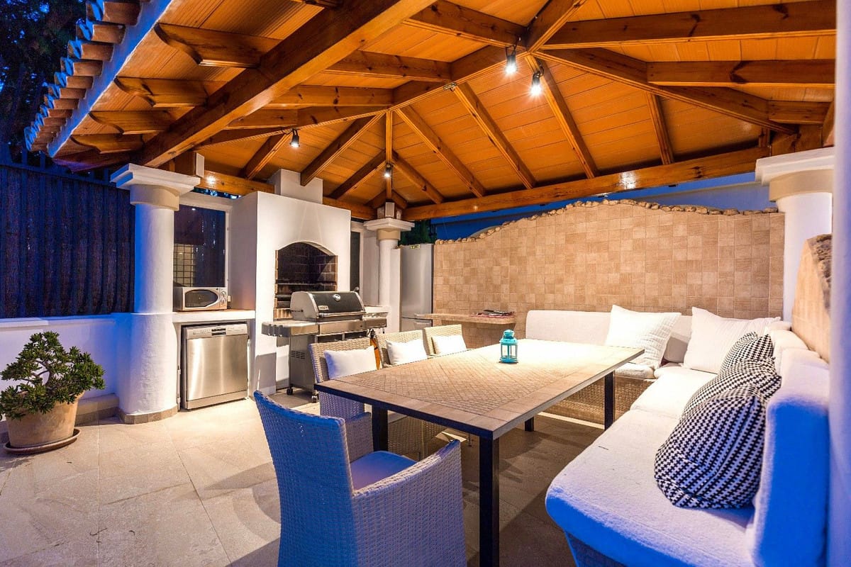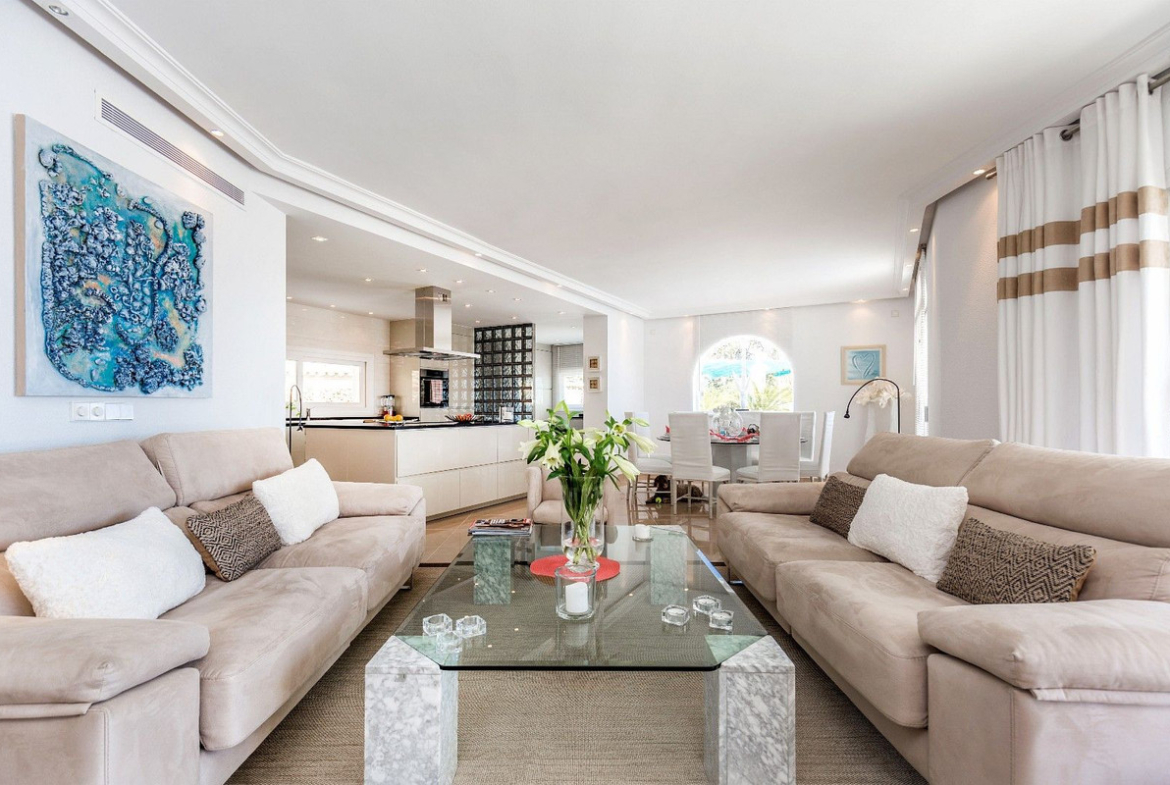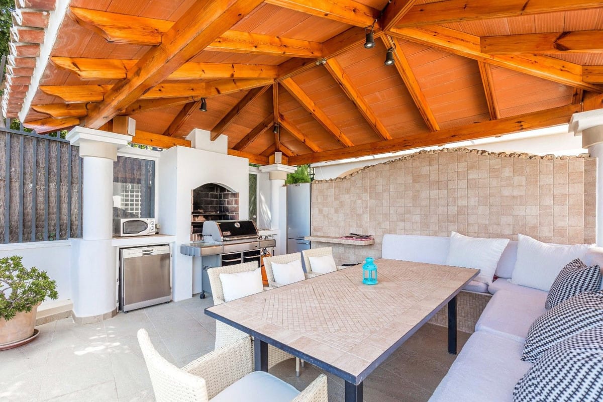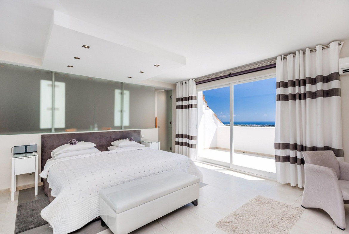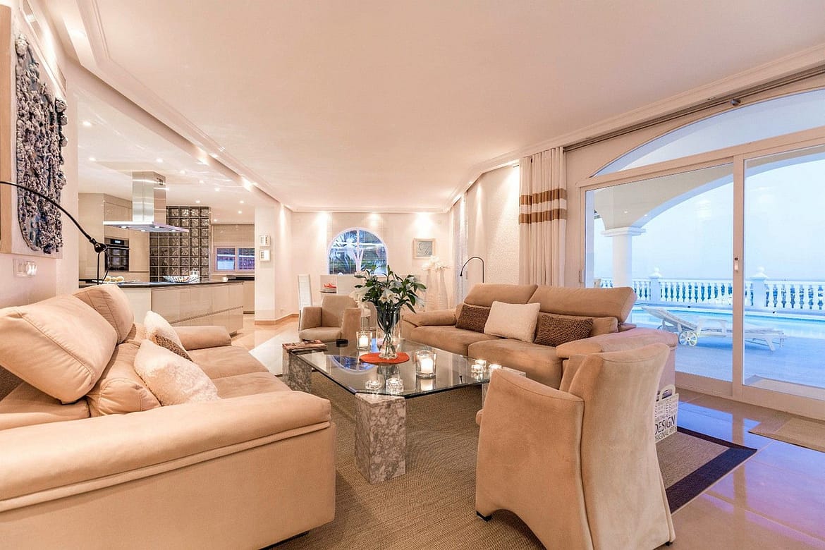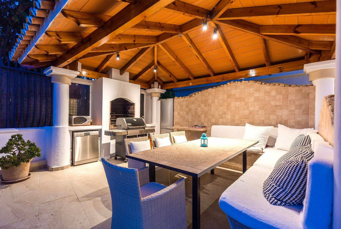 Spacious and luxuriously fully furnished villa with 12 beds. There is sun from morning to evening New large tiled outdoor area -terrace – with many sitting groups – Sunbeds and a 15 meter pool on the terrace. BBQ with Weber grill – fireplace – refrigerator – washing machine – Down Lights – music Absolutely perfect for atmospheric cool evenings with good food – wine and soft lighting from the terrace and pool. Large living room with comfortable sofa, perfect for relaxing, flat screen TV, music, fireplace, dining room. Kitchen fully equipped with coffee machine, kettle, toaster, iron, microwave, dishwasher, stove, 2 fridges, freezer. Very large selection of service – glass for 12 people. There are 5 Delicate bedrooms with en-suite bathroom, bathtub/shower, all with hair dryer 1 guest toilet
