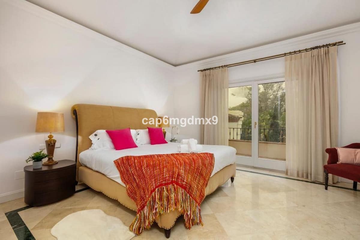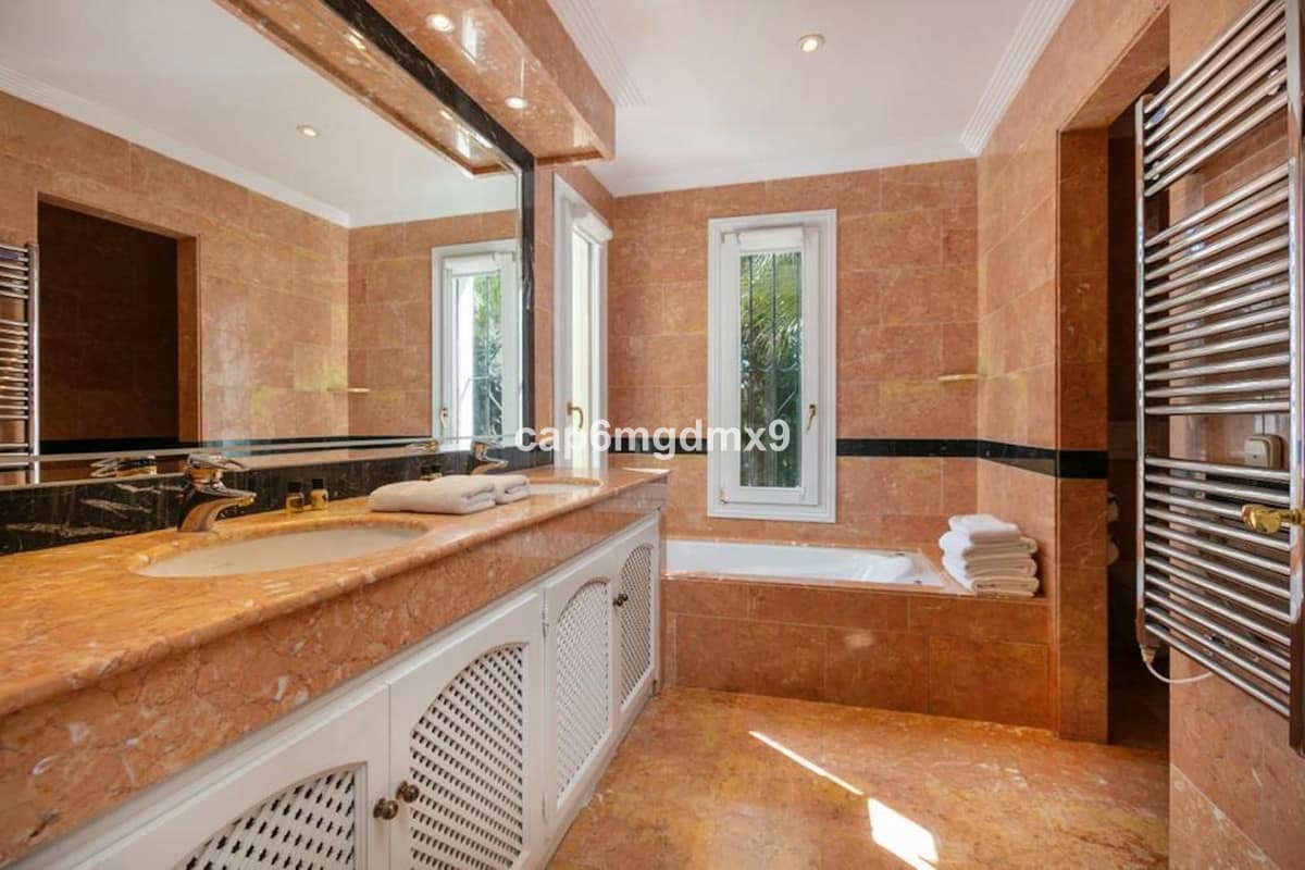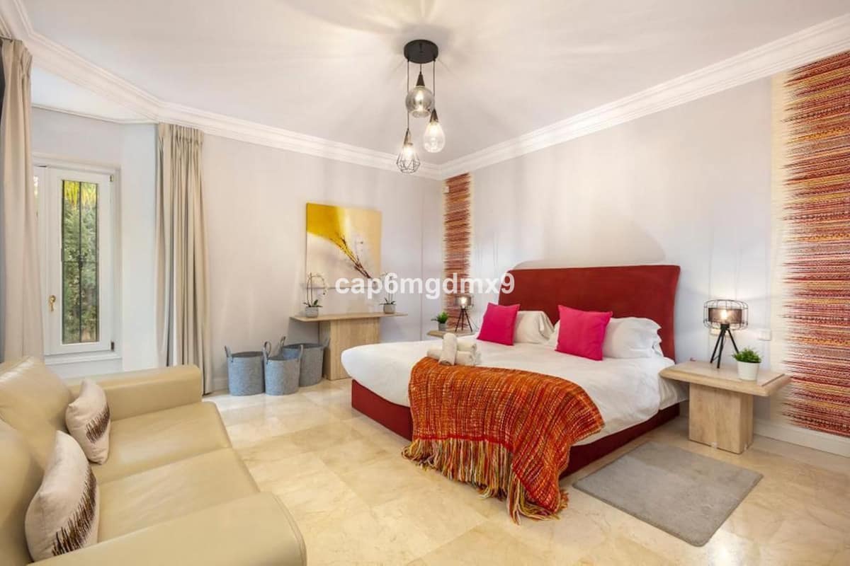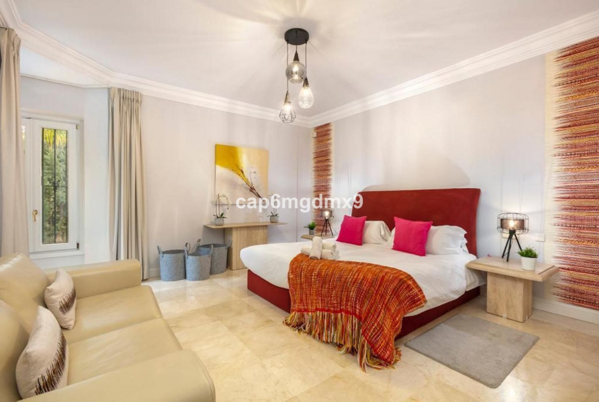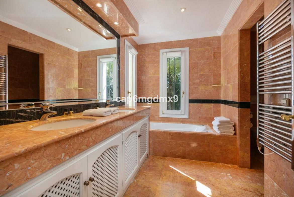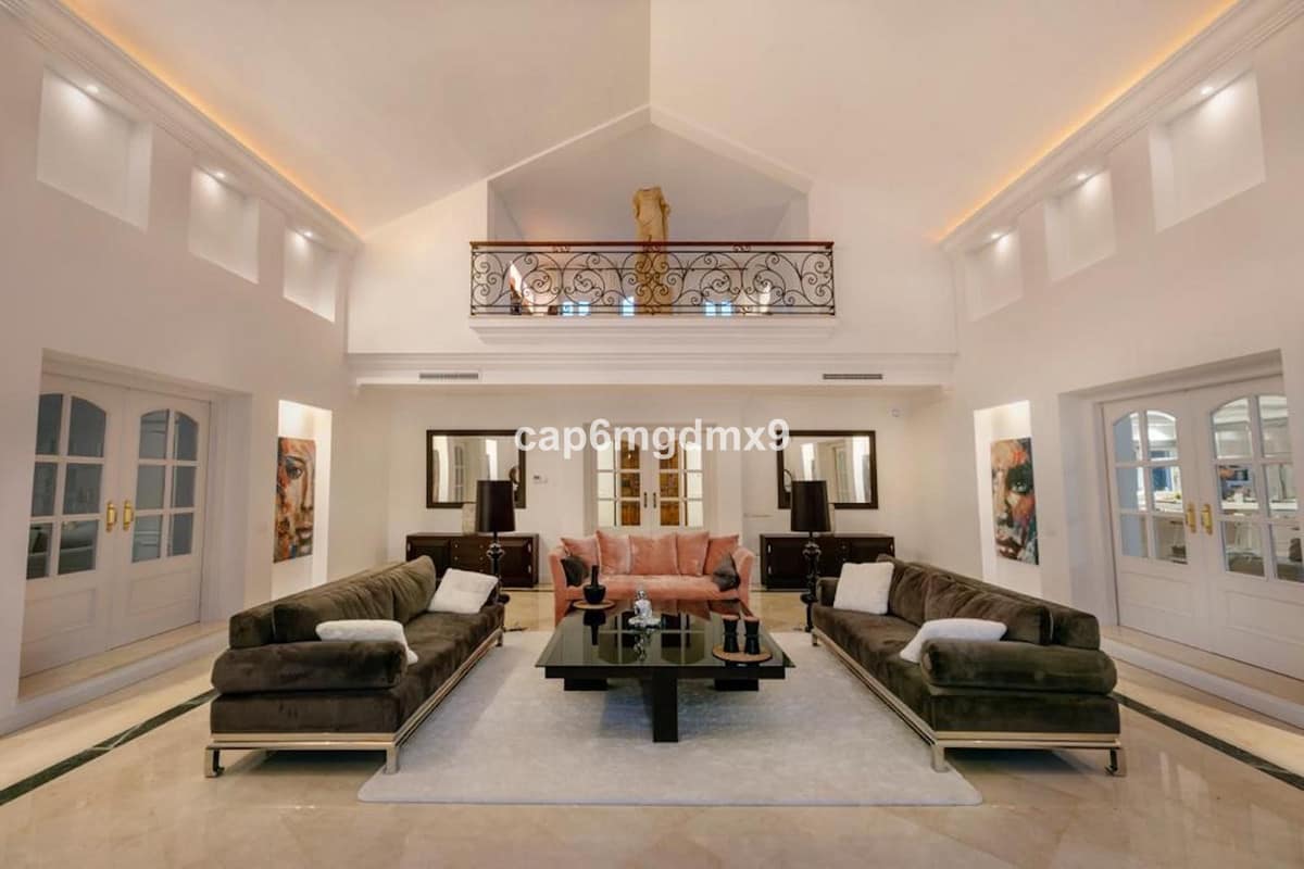 Frontline golf villa located in one of the best areas of Nueva Andalucia, 6 bedrooms and 6 bathrooms. On the ground floor is an entrance room leading to a large living area with double height ceilings, a fully fitted modern kitchen, a dining room, a tv room, a guest toilet and two guest bedrooms with en suite bathrooms. From the living room you have direct access to the large covered terraces and swimming pool. On the first floor are 2 bedrooms with en suite bathroom and private terraces overlooking the pool and garden. On the lower level is a one bedroom with 2 individual beds and another bedroom with double bed, ensuite bathroom and kitchen. Outside is a landscaped garden, private heated pool with decking around and lounge chairs, gazebo, BBQ and dining area.