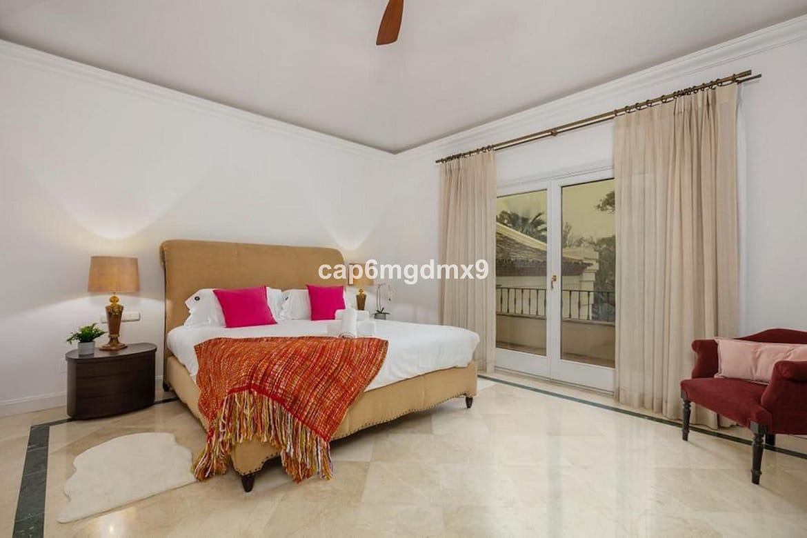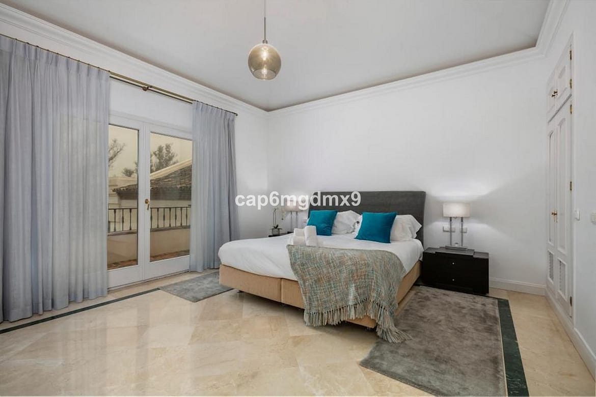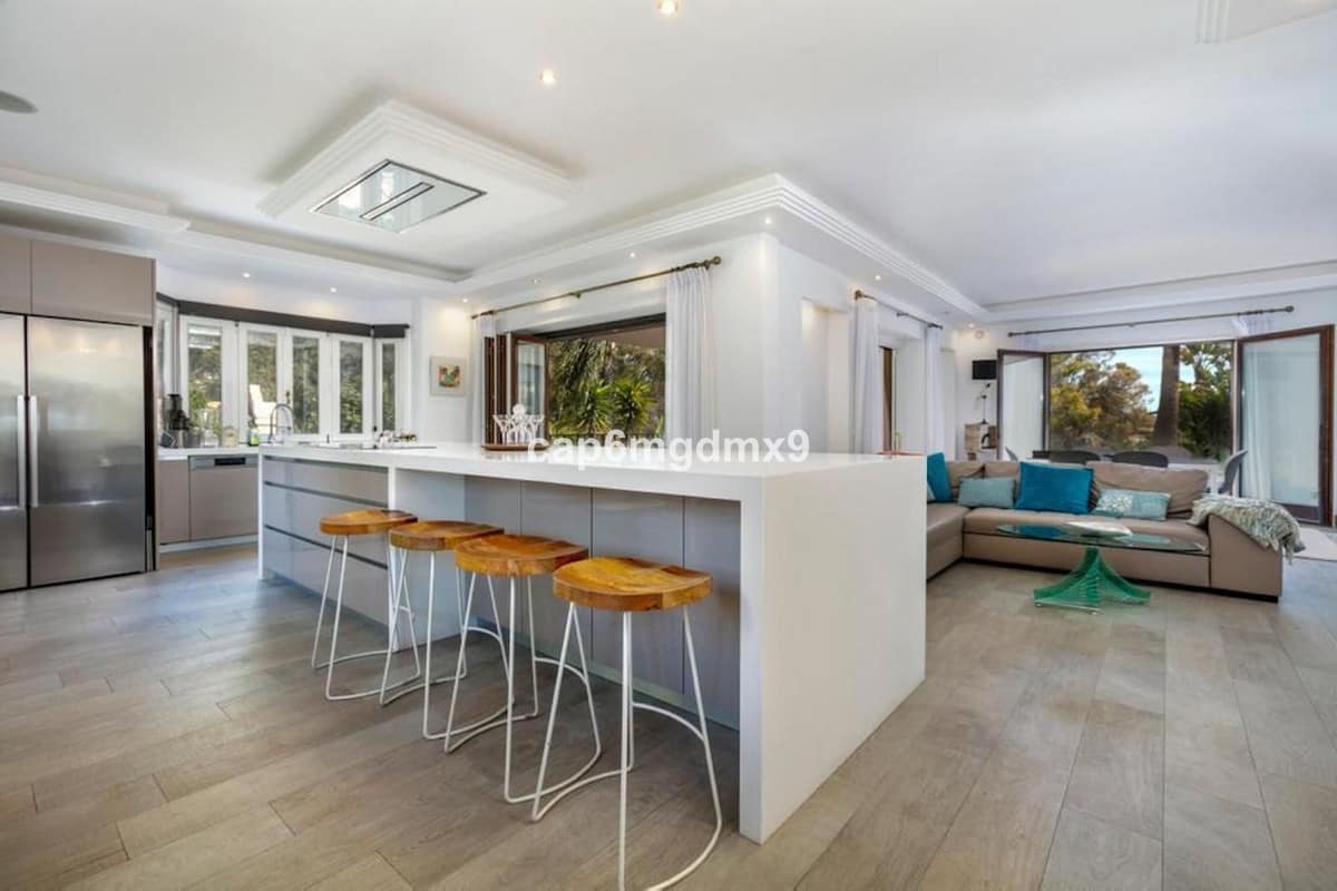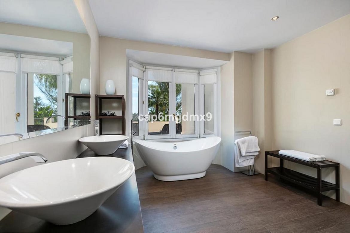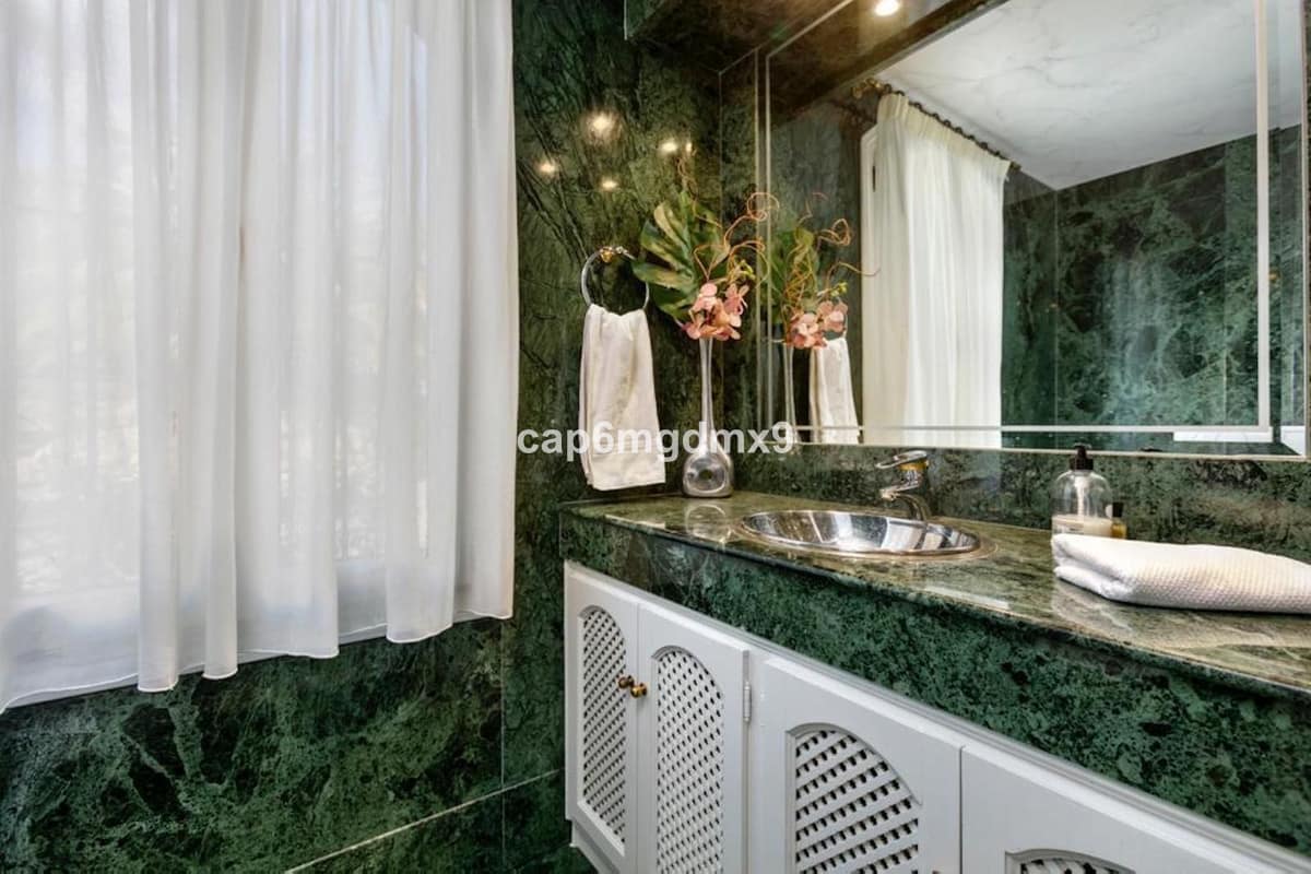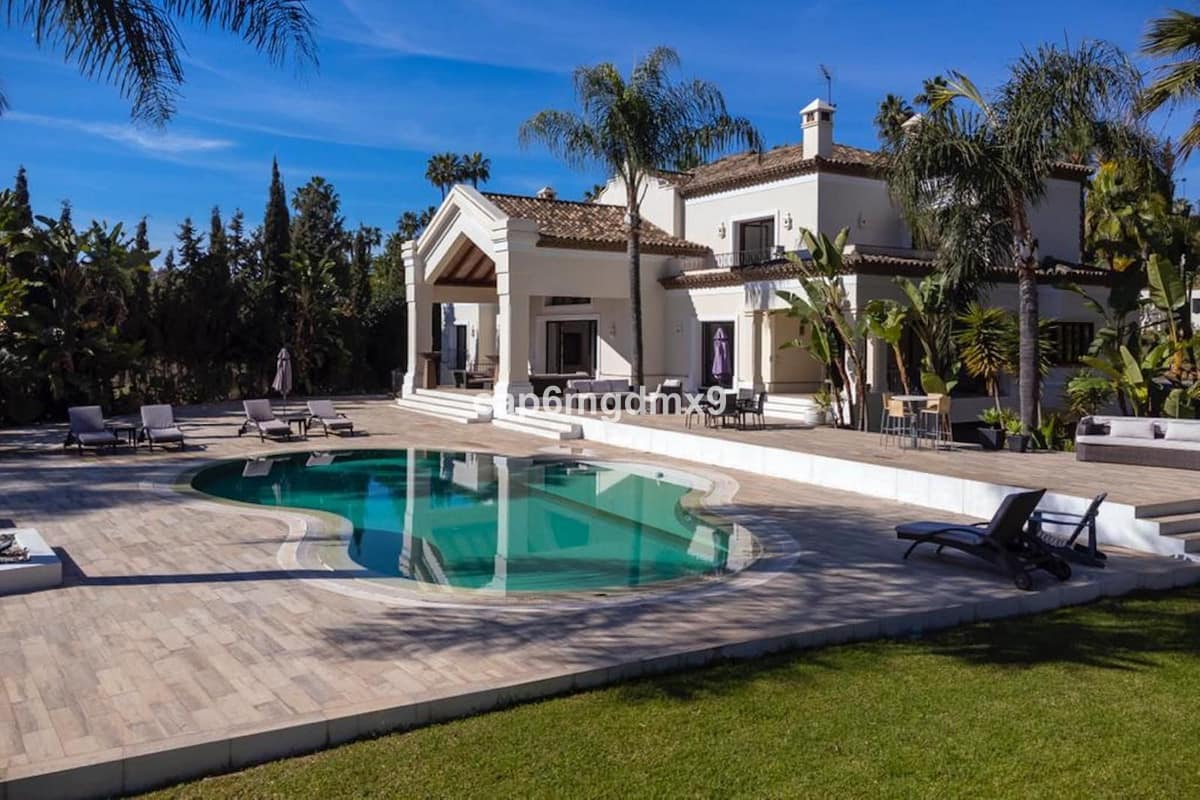 Frontline golf villa located in one of the best areas of Nueva Andalucia, 6 bedrooms and 6 bathrooms. On the ground floor is an entrance room leading to a large living area with double height ceilings, a fully fitted modern kitchen, a dining room, a tv room, a guest toilet and two guest bedrooms with en suite bathrooms. From the living room you have direct access to the large covered terraces and swimming pool. On the first floor are 2 bedrooms with en suite bathroom and private terraces overlooking the pool and garden. On the lower level is a one bedroom with 2 individual beds and another bedroom with double bed, ensuite bathroom and kitchen. Outside is a landscaped garden, private heated pool with decking around and lounge chairs, gazebo, BBQ and dining area.
