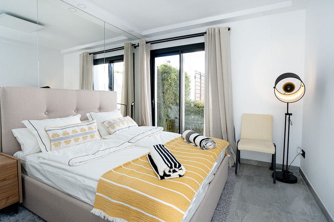 First floor: 2 bedrooms comprising a master bedroom with a bathroom and a second smaller bedroom also with ensuite bathroom. The master bedroom has a view of green country areas side which give the feeling of living in a park or forest. In addition, on the first floor, there is a spacious terrace with a beautiful view of the Arena entertainment complex and the surrounding area, allowing you to listen to concerts in various music styles free of charge taking place there. The villa is in perfect condition, clean, well-maintained with modern furnishing and very well lit. Despite being located near many attractions and entertainment, the location itself is quiet as it is at the end of a closed street. At the back of the villa there are charming green areas not intended for development, guaranteeing complete privacy.