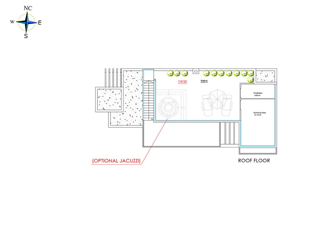 The roof floor offers a spacious solarium area with a pre-installation of a built-in Jacuzzi. There are some partial sea views from this level.