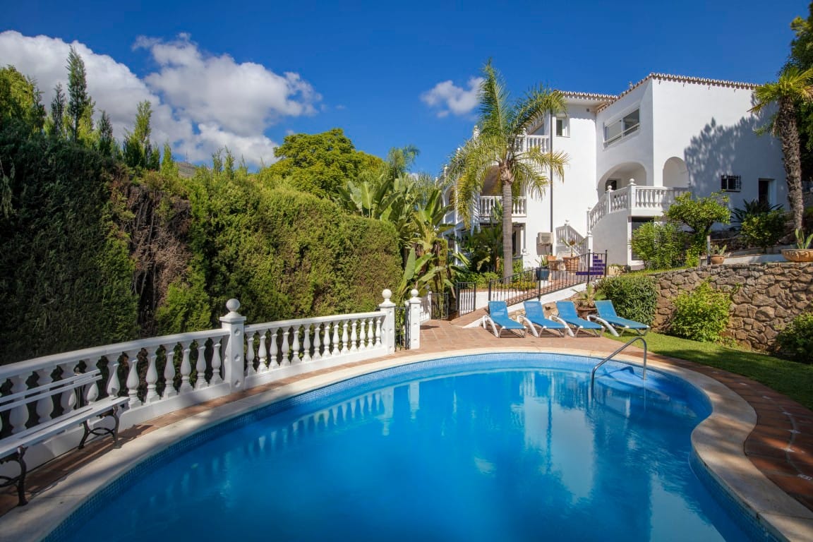The exterior is a true Mediterranean retreat, with a lush, mature garden and water features surrounding a large private pool, complete with shower area, outdoor bathroom, and a fully equipped summer kitchen with BBQ, ideal for entertaining and enjoying the Costa del Sol climate. The property also includes a covered garage and additional on-site parking.