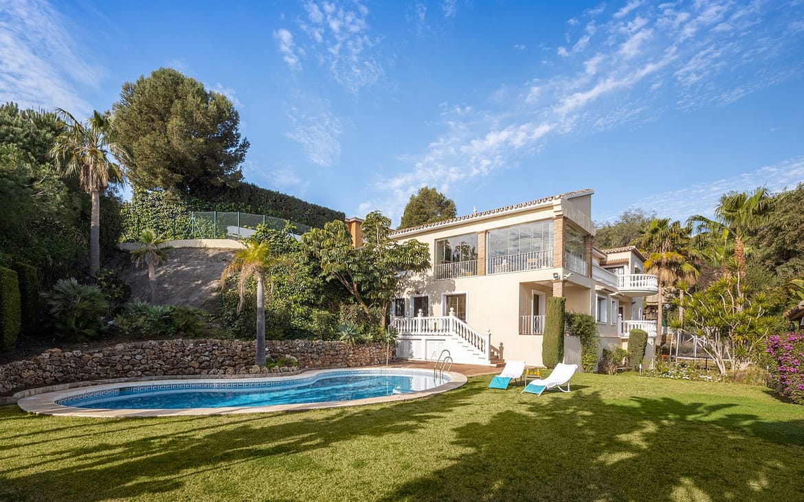 Beautiful 6-bed villa with pool and ample garden in El Paraiso, Benahavís. Located in an exclusive and tranquil area, this Mediterranean-style villa with its 1645m2 garden and orchard ensures a truly Andalucian luxury lifestyle. Thanks to its elevated position, you will have unspoiled views over the golf course towards the mountain and the sea. 4 out of the total 6 bedrooms have en-suite bathrooms, while there are two separate ones as well, making it ideal for renting due to the possibilities of variation.