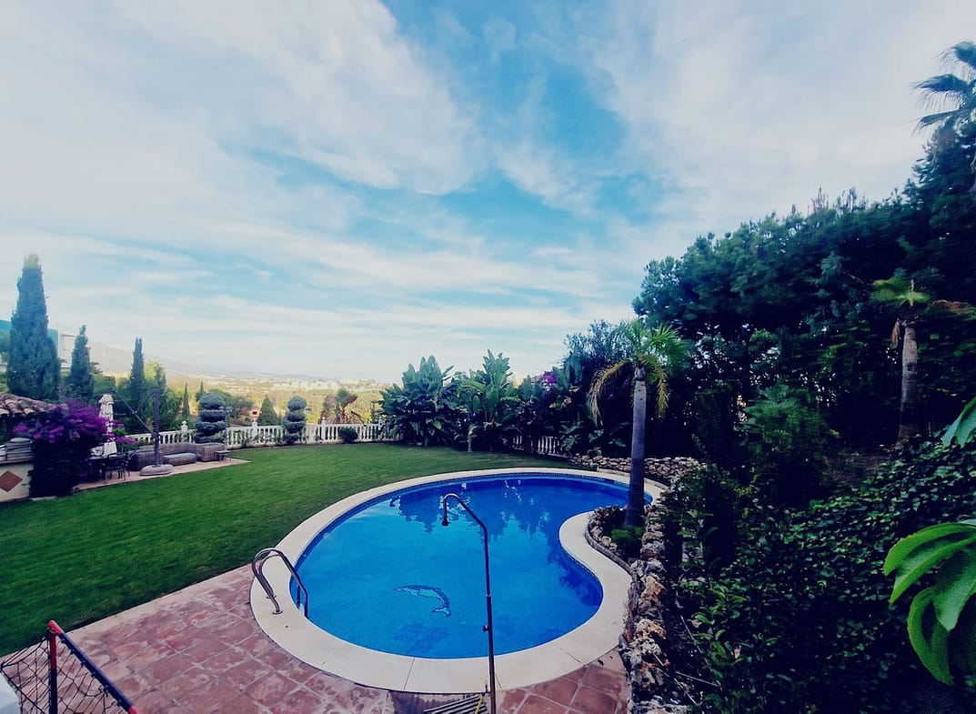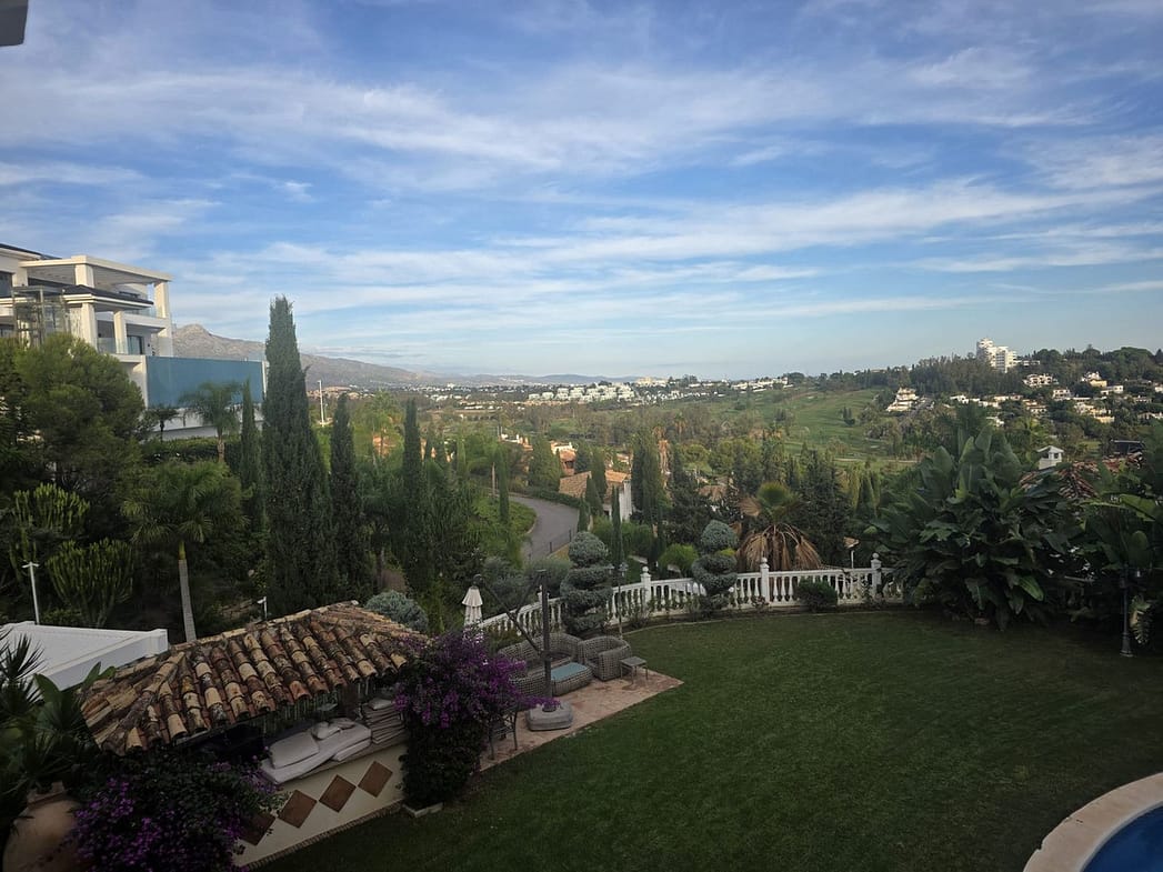 The villa sits on a 2,000 m² plot and features a swimming pool, spacious garden, and orchard with avocado and lemon trees. Its elevated position provides views of the golf course, mountains, and sea.