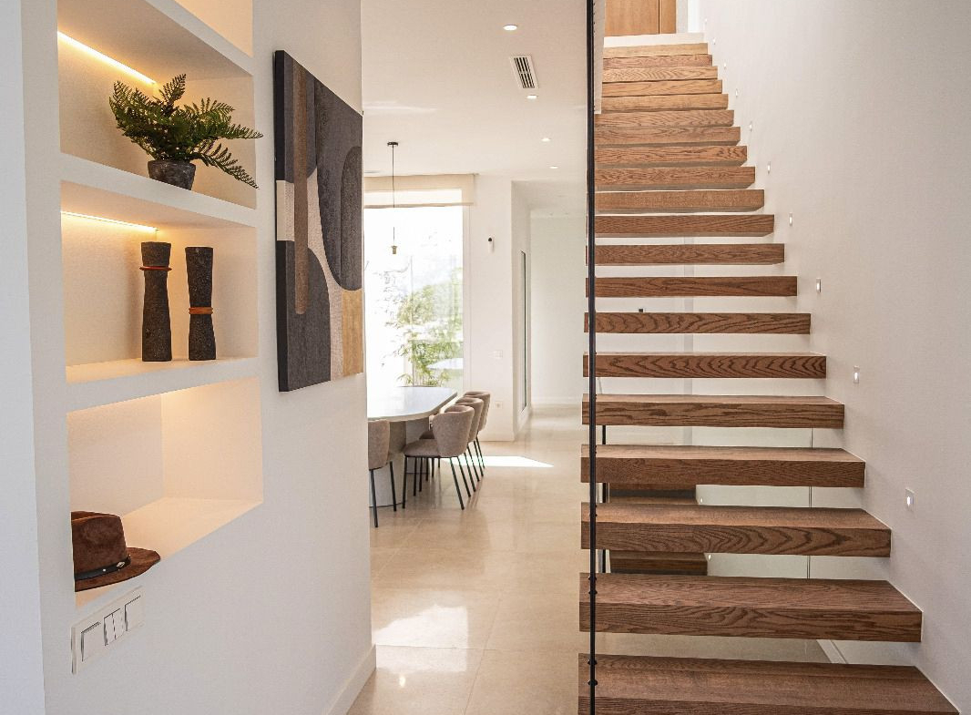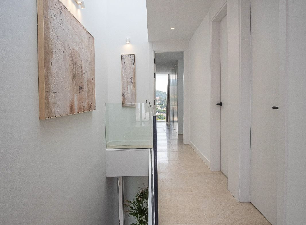Upper floor (entrance): dedicated to the sleeping area, featuring the elegant master bedroom along with two additional bedrooms, all with en-suite bathrooms.