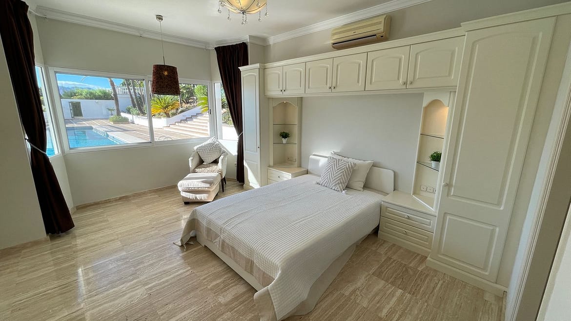 The private 12 x 20 meter swimming pool is truly magnificent, with a uniform depth of 1.60 m, there is a raised platform with sun loungers for the ultimate experience in relaxation. The self-contained guest house has views and direct access to the beautiful swimming pool. Lovely covered porch. It consistes of a central lounge with open-plan fitted kitchen. Air con h+c. Two bedrooms, both en suite, with plenty of cupboard space.