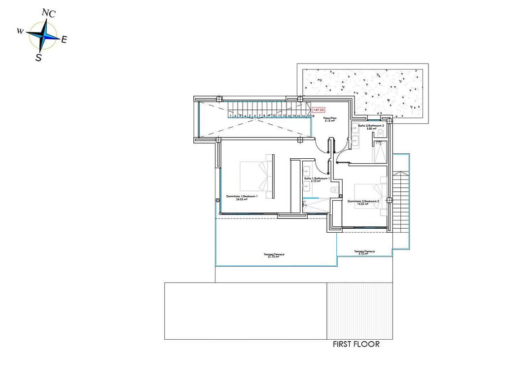 The first floor is distributed in a Master bedroom en-suite with it spacious private terrace and the second guest bedroom with its own bathroom and a balcony.