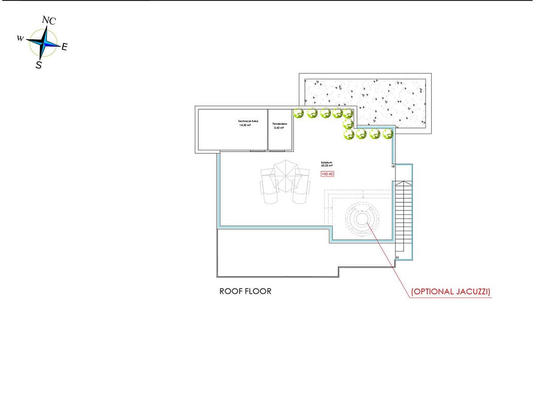 The roof floor offers a spacious solarium area with a pre-installation of a built-in Jacuzzi. There are some partial sea views from this level.