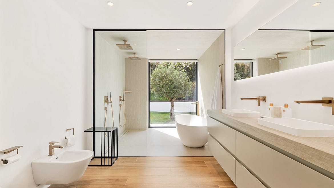 The villa is built mainly all on one level plus lower level, quite rare to find on the market. It has a fresh, modern feel throughout. Decorated in a soft, neutral palette, it feels relaxed, luminous and welcoming.