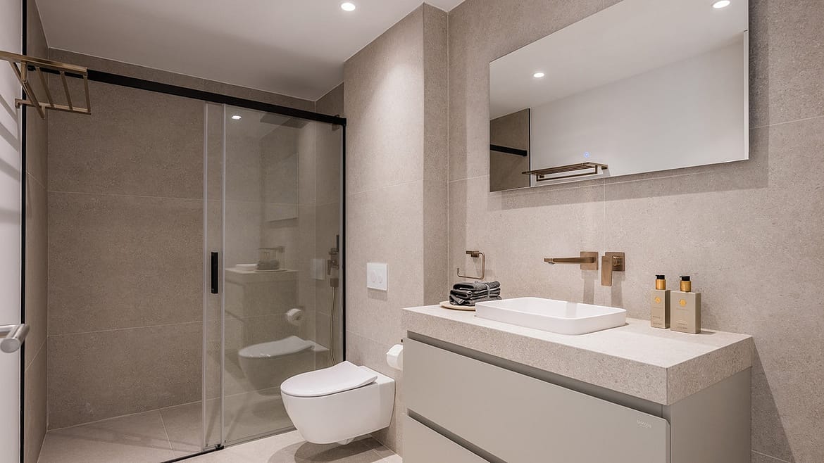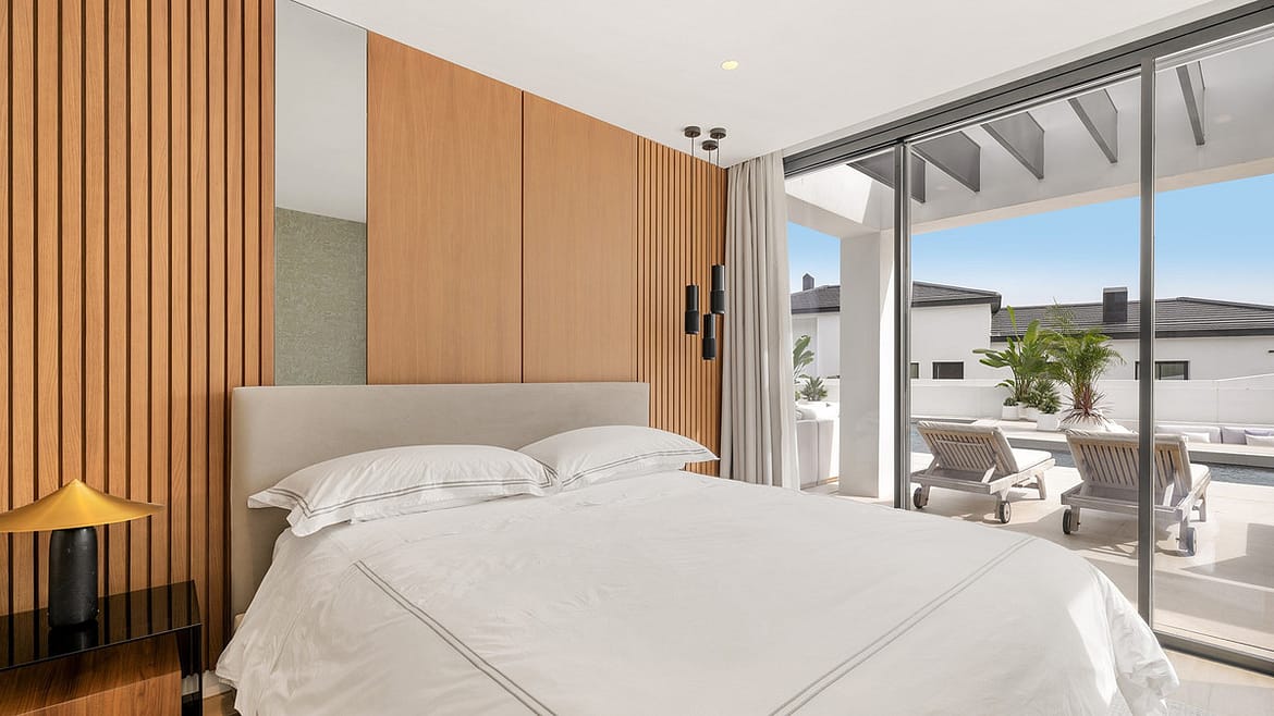 The layout is practical and flows well. On the main level, the bright, open-plan living and dining area connects seamlessly to a modern kitchen designed by BD Home & Living with Siemens appliances and a large central island which anchors the space, perfect for everyday living and entertaining alike. Large sliding doors open onto a generous terrace of approximately 180 m², seamlessly connecting the interior with the landscaped garden. Four en suite bedrooms and a guest toilet complete the ground floor.