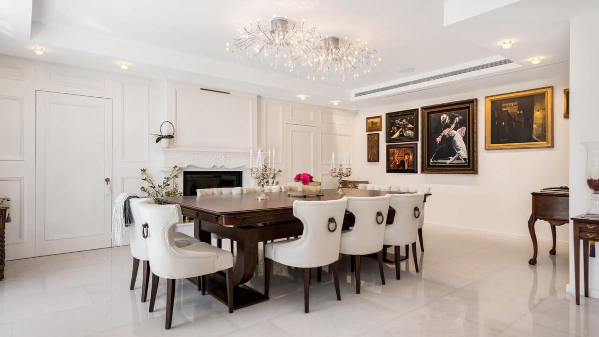 The home’s main living area features a stylish curved sofa set around a sleek fireplace, built-in shelving with accent lighting, and large framed artwork that adds warmth and character. A separate formal dining room includes a long wooden table with upholstered chairs, twin chandeliers, and another fireplace, creating a refined setting for entertaining.