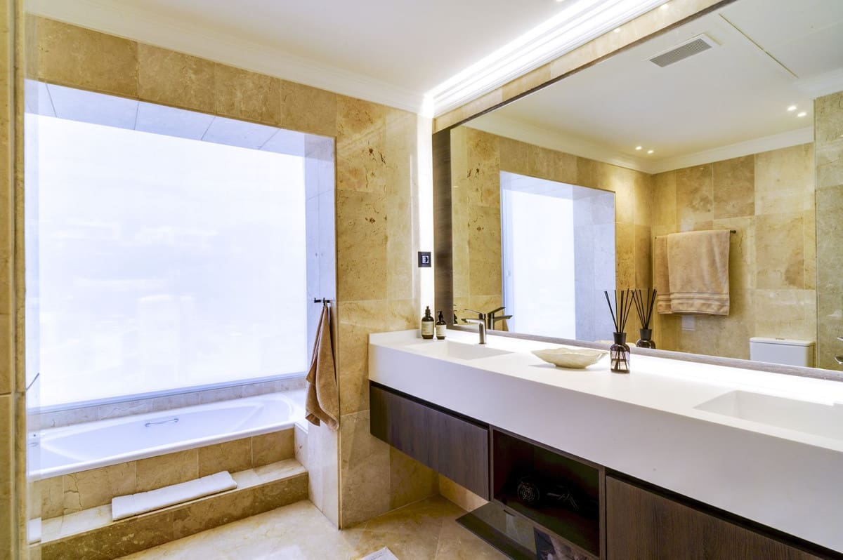 On the upper level is the master bedroom with its own walk in closet and spacious terrace with beautiful views over the golf valley, and towards the sea.