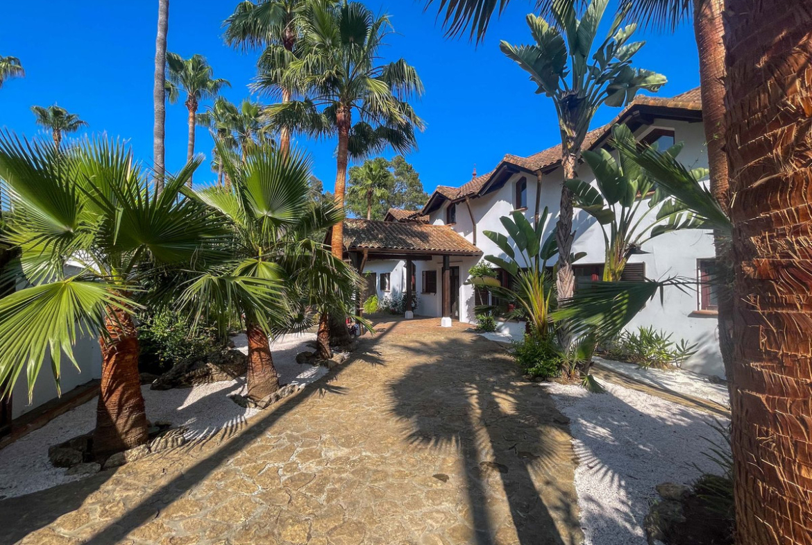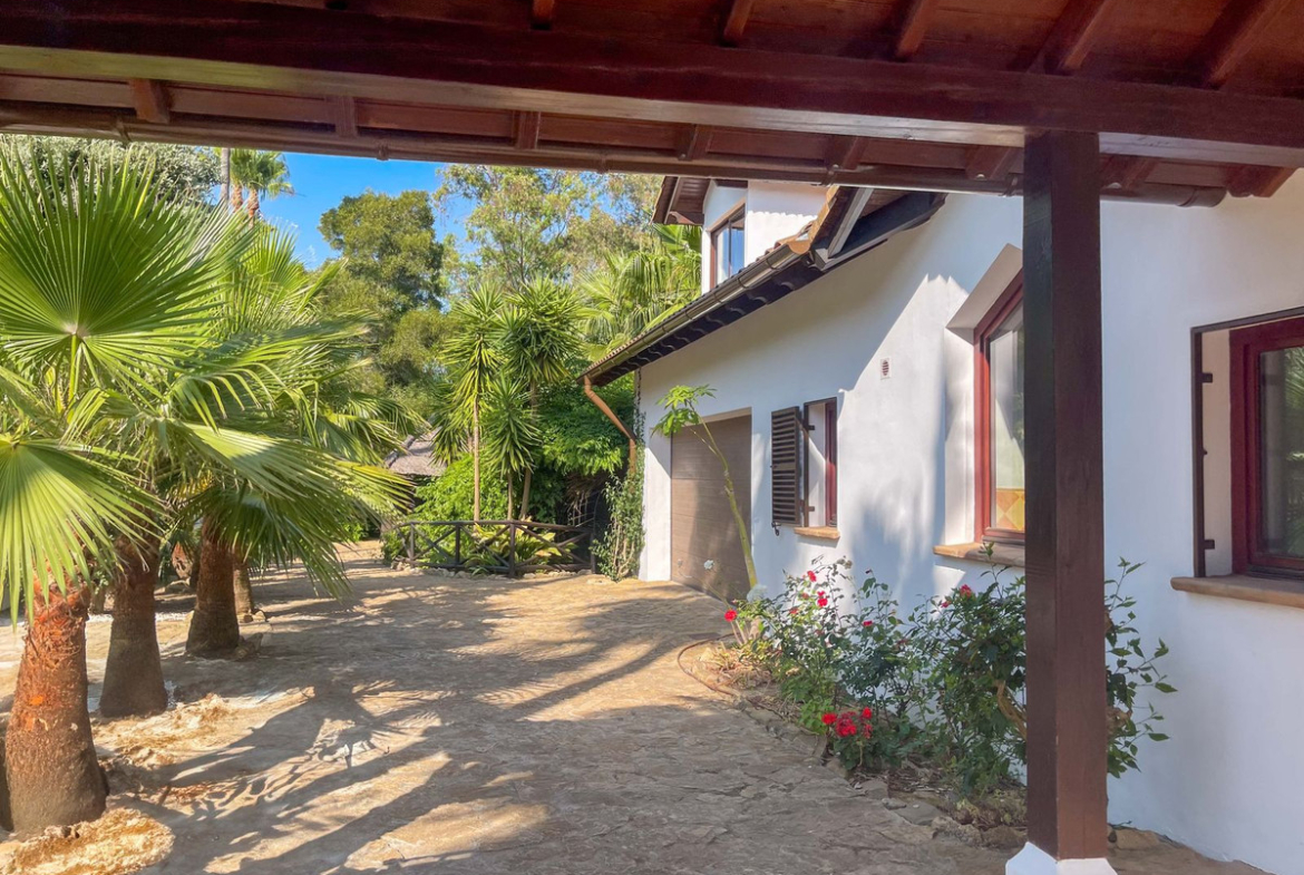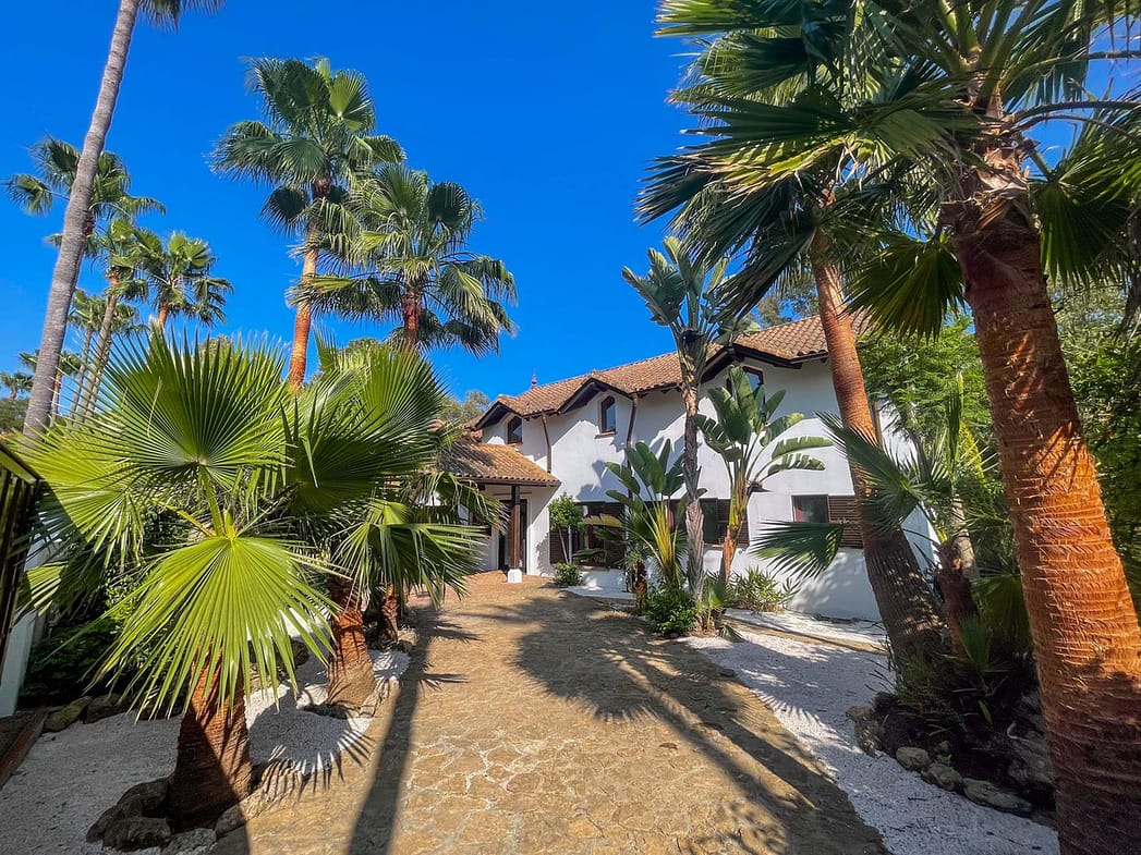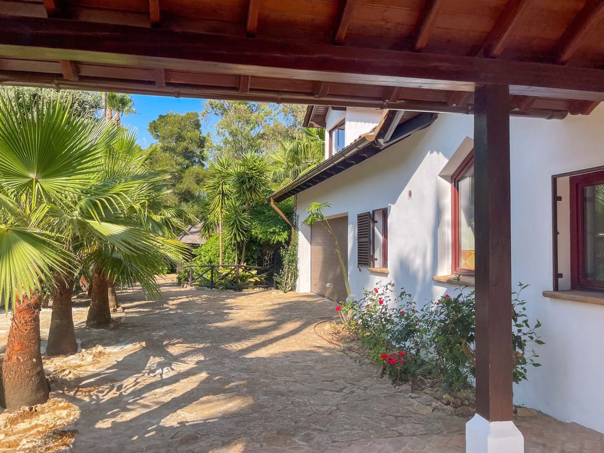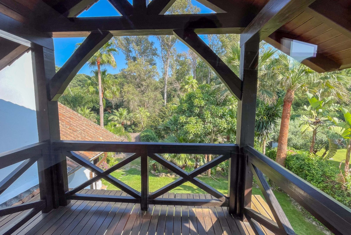 This traditional-style villa is located between Valderrama and the Almenara golf course, surrounded by mature woodlands and landscaped gardens. Spread over three floors, it features rustic elements such as wooden beams, a stone fireplace, and double-glazed windows. The property offers 6 bedrooms, 3 living rooms, two spacious kitchens, and access to balconies and gardens from the bedrooms. It also includes a separate pool house, barbecue area, pergola, and a wooden deck overlooking the pool.