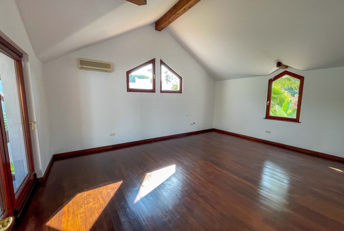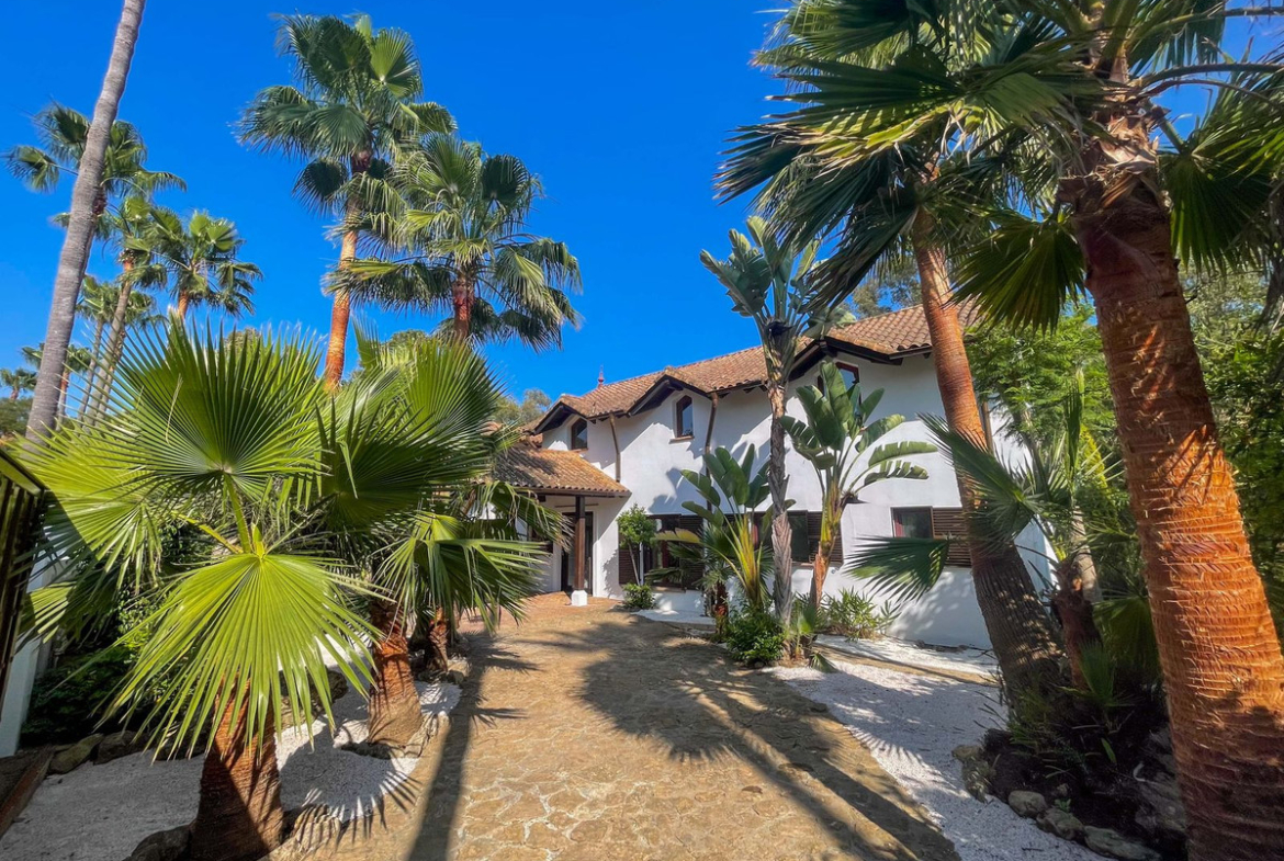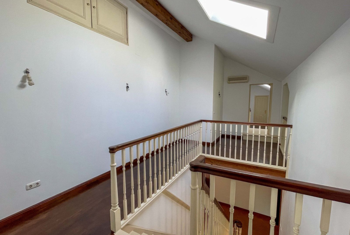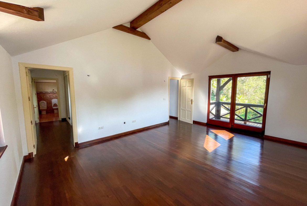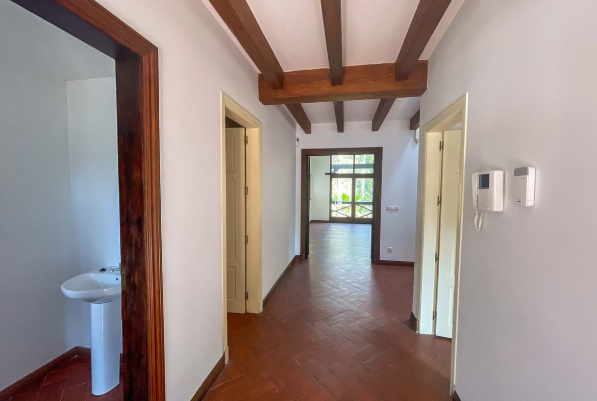 This traditional-style villa is located between Valderrama and the Almenara golf course, surrounded by mature woodlands and landscaped gardens. Spread over three floors, it features rustic elements such as wooden beams, a stone fireplace, and double-glazed windows. The property offers 6 bedrooms, 3 living rooms, two spacious kitchens, and access to balconies and gardens from the bedrooms. It also includes a separate pool house, barbecue area, pergola, and a wooden deck overlooking the pool.