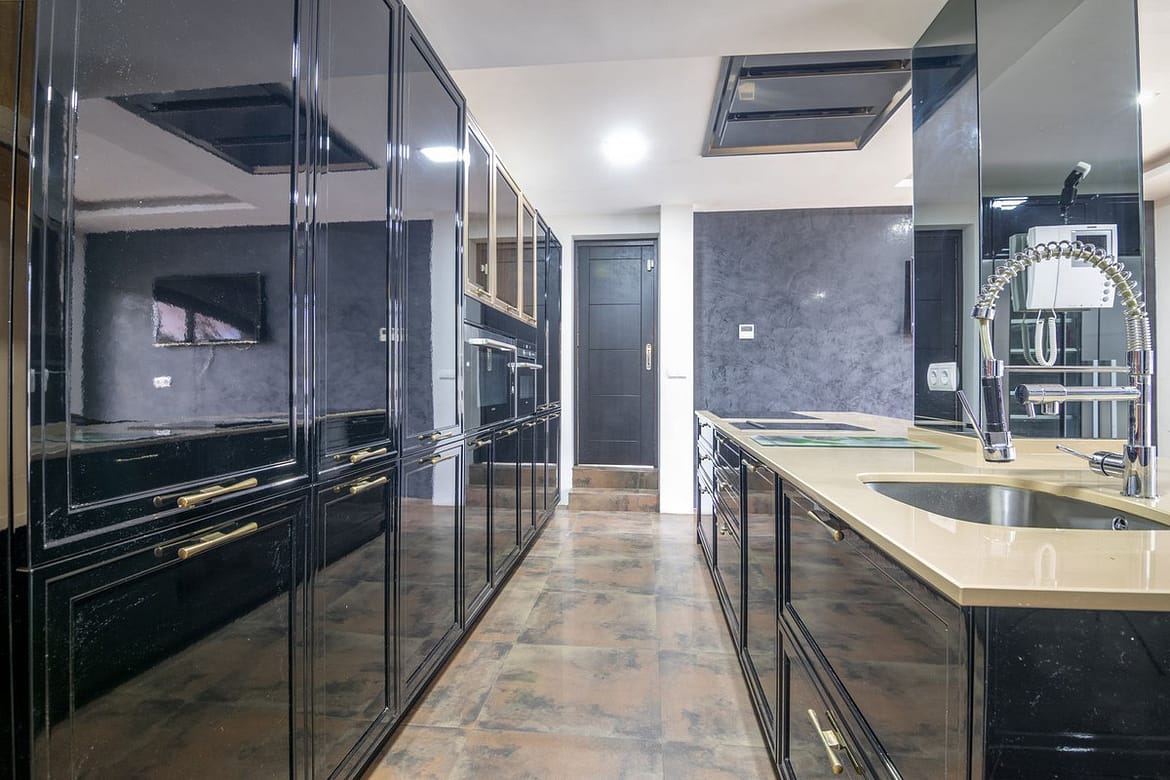The kitchen is separate and equipped with all the necessary amenities. It also offers direct access to the garage, which has space for two cars, providing convenient and secure access.