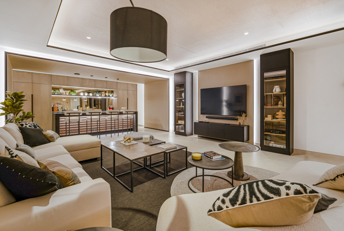 The lower level of the villa is designed for relaxation and entertainment, with a lounge area, bar, pool table, and two additional guest suites. This floor also provides access to a private garage with space for three cars, including electric car chargers.