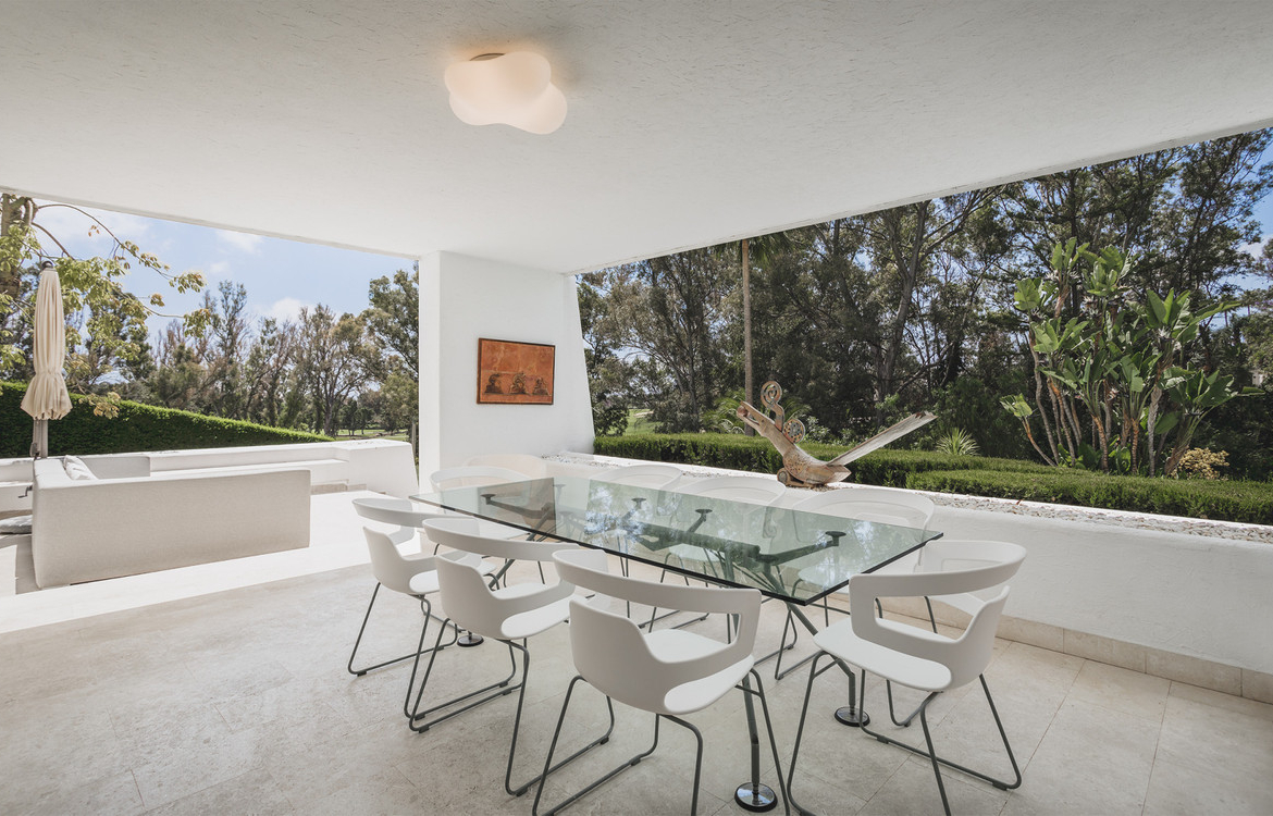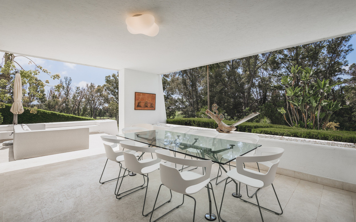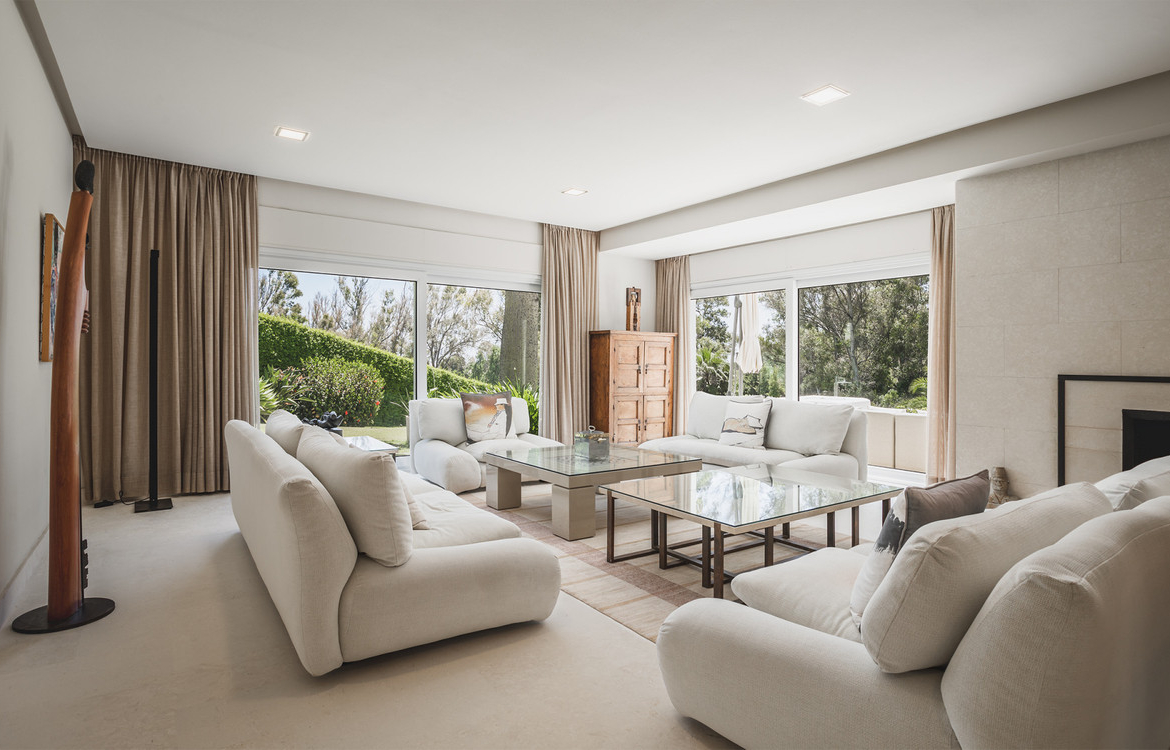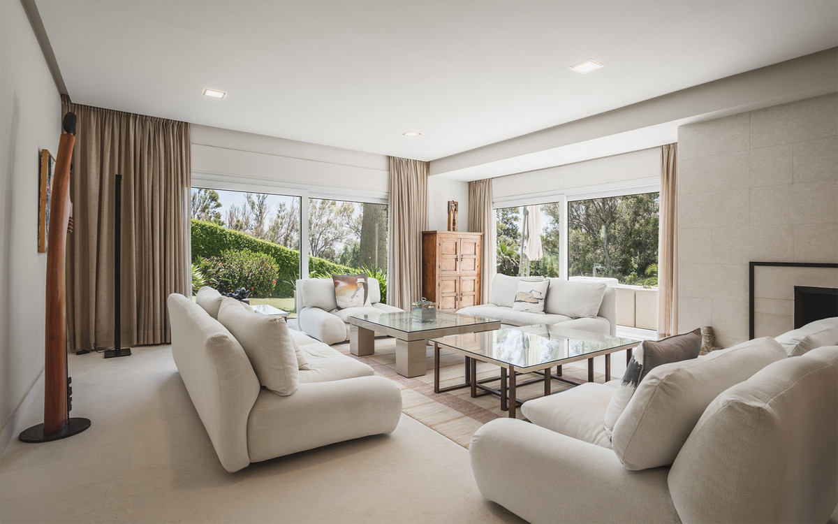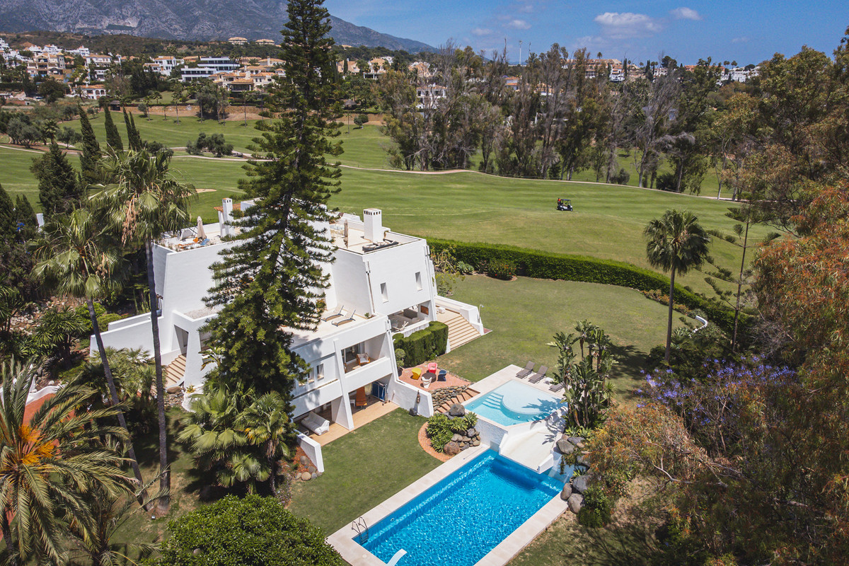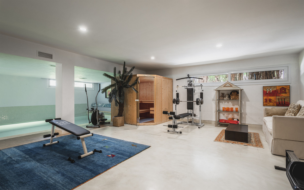 Frontline golf villa in La Cerquilla, Nueva Andalucía. Distributed over 3 floors comprising seven bedrooms, two outdoor swimming pools with a waterfall, spacious living room with separate dining area, elevator, gym, sauna and heated indoor pool. Situated in a quiet area of Nueva Andalucia but still only a 5 min. drive to Puerto Banus and the beach.