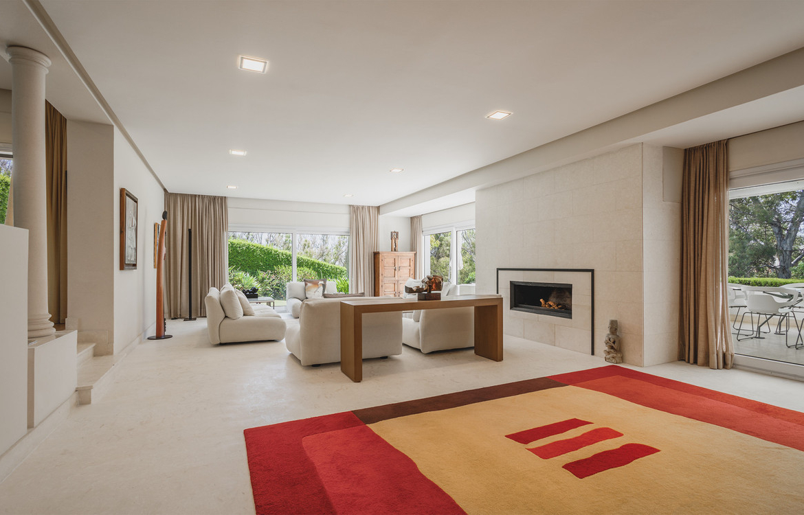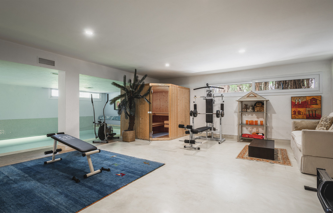 On the lower level the property offers two bedrooms (one with en-suite bathroom and access to a private terrace and the garden), gym, table tennis, sauna, indoor swimming pool. Ground level: Living room with fireplace opening onto the terrace and with access to the large impeccably maintained gardens and swimming pools, dining room, several terraces, kitchen, laundry room and staff quarters with shower, bedroom with double bed, en-suite bathroom and large wardrobe area, terrace.