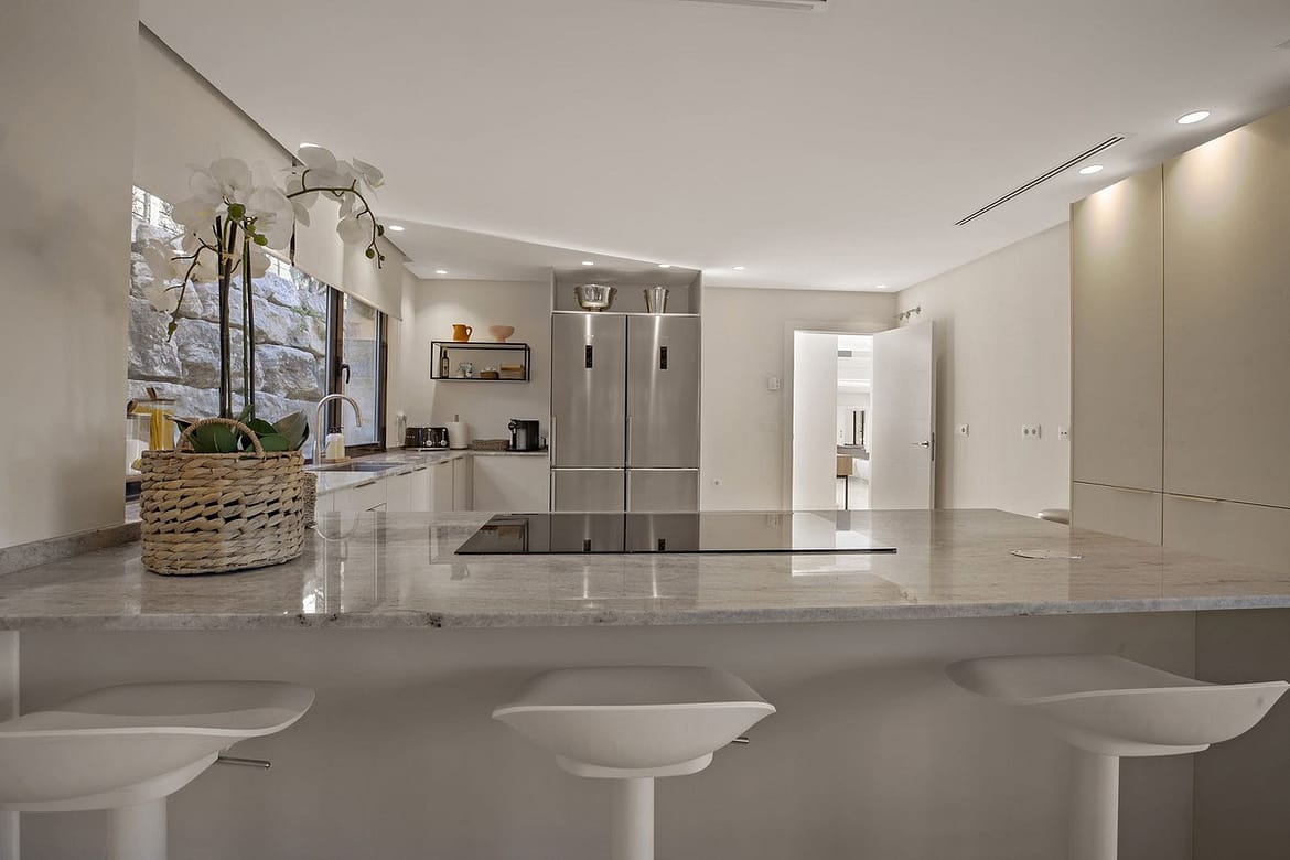 Lower floor: Direct access to the baby pool, garden, and sunny terrace. Here you’ll find a fully equipped fitness and games room (with table football and billiards), a table tennis room, a separate guest apartment, and an underground garage for three cars.