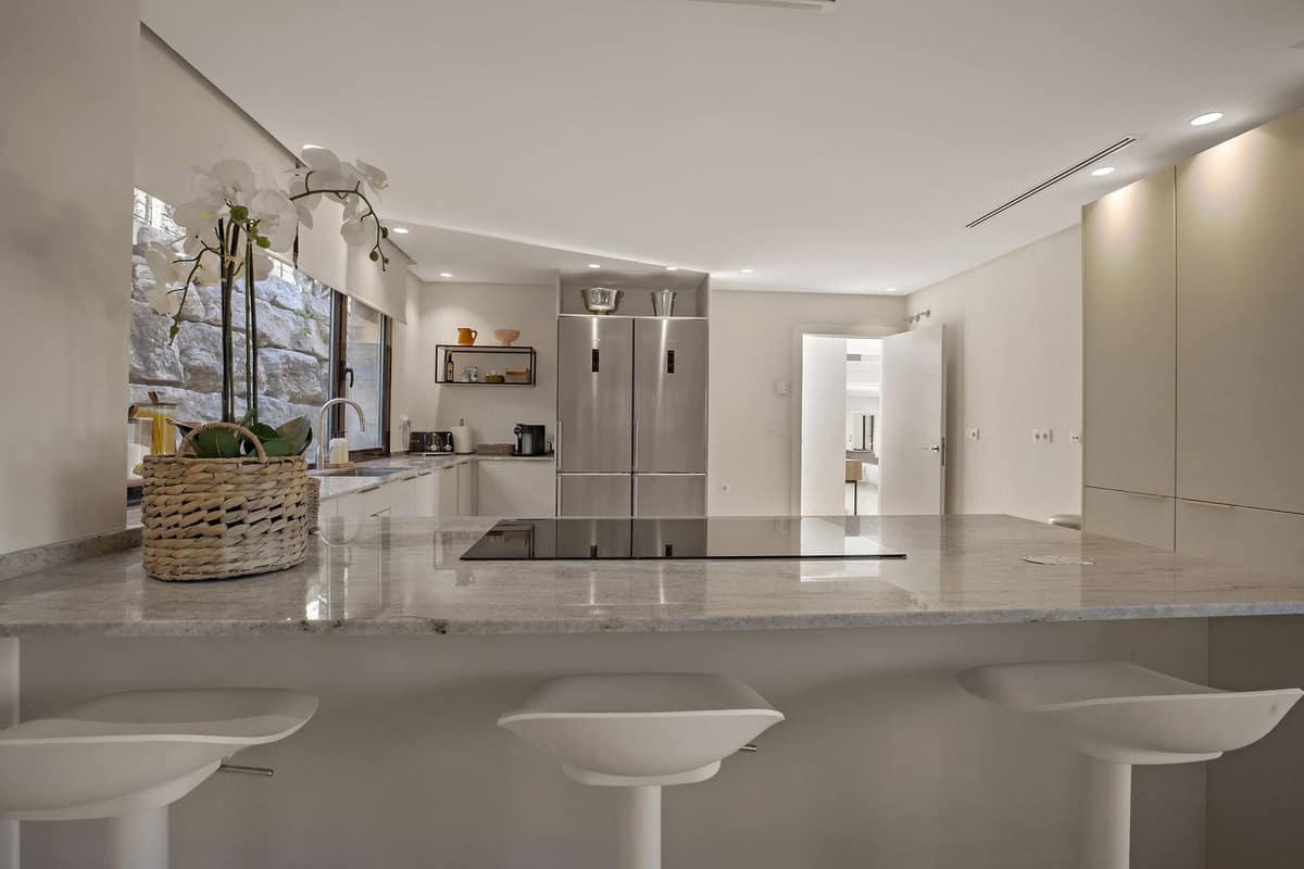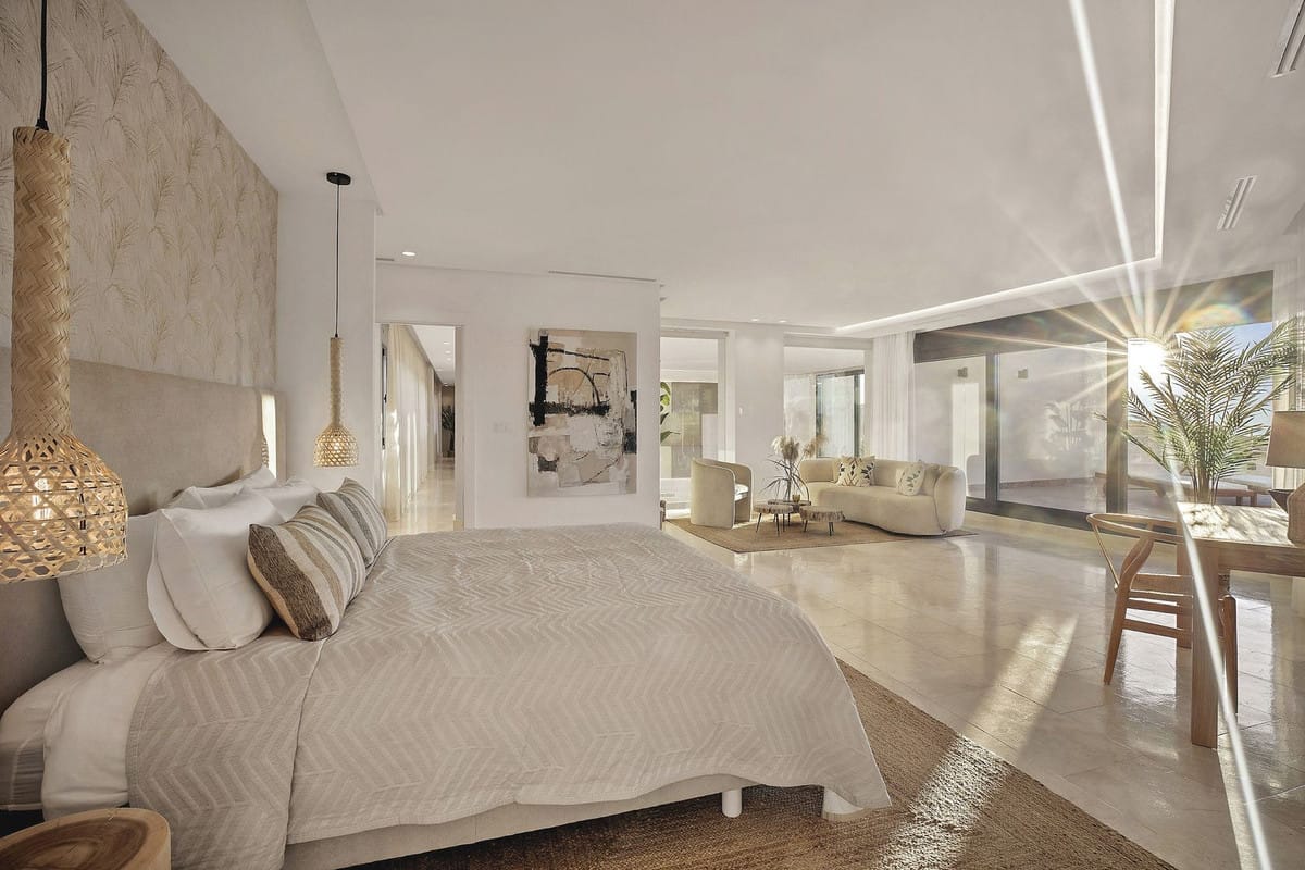 Inside, the villa is designed with comfort and style. All seven bedrooms are en-suite, featuring high-quality finishes, underfloor heating, and full air conditioning. Almost every room enjoys stunning sea views.