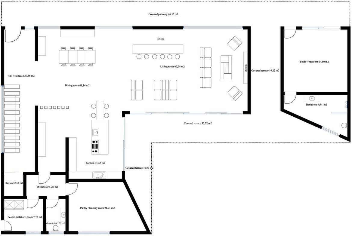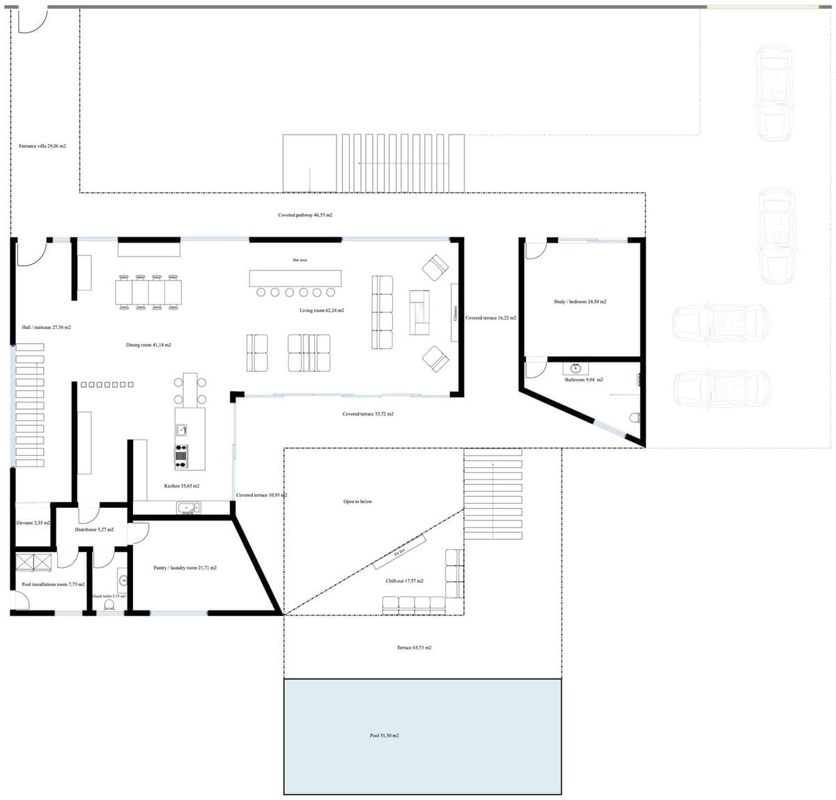 The ground floor: entrance hall with lift, guest toilet, technical installations room, spacious living/dining room with large open plan fully fitted kitchen with Bosch appliances and separate pantry, furthermore there is on this floor a separate bedroom/study with en-suite bathroom, large, covered terraces overlooking the large 51,50 m2 heated swimming pool.