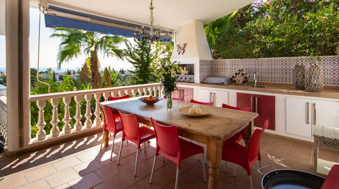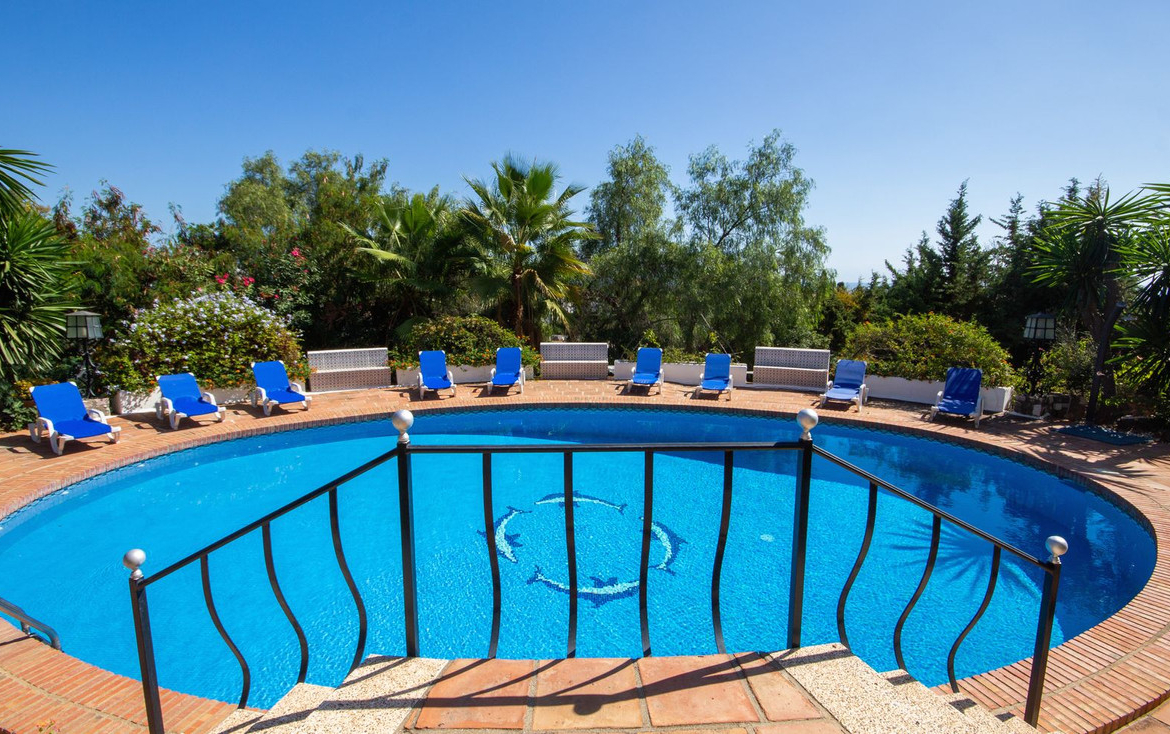 This property is stunning! Set in the heart of Mijas Costa, in the desirable Campo Mijas area. From the private entrance there is a driveway and garage, with steps down into the main entrance. This floor has a very spacious lounge area, with a great reception area and plenty of comfortable chairs, to take in the Hollywood style which the villa exudes. This then takes you down to the focal point of the villa, which is the pool and the beautiful gardens. Elevated higher is the dining area and a big kitchen. The bedrooms branch off to the other side of this main level. Up higher is an attractive bedroom which has been modernised, with a stylish en suite bathroom and a great terrace, to behold the spectacular views. From the outdoor terrace, which overlooks the pool, there is an independent apartment which again has a very nice lounge area, and on the other side of this lower area is a huge indoor bar and games room. Great for those lazy summers!