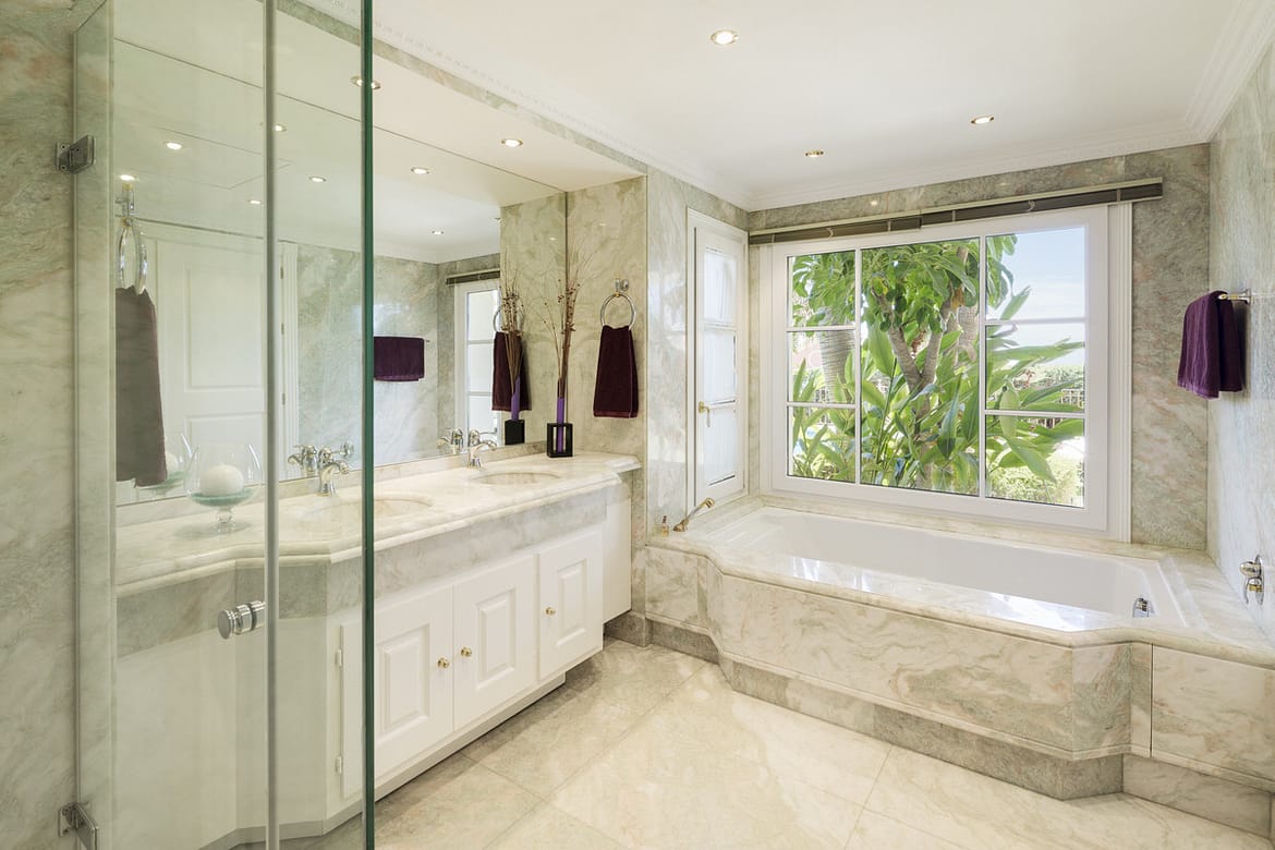 • exquisite Arabian marble in the bathrooms, mined from the private quarry of a Saudi prince