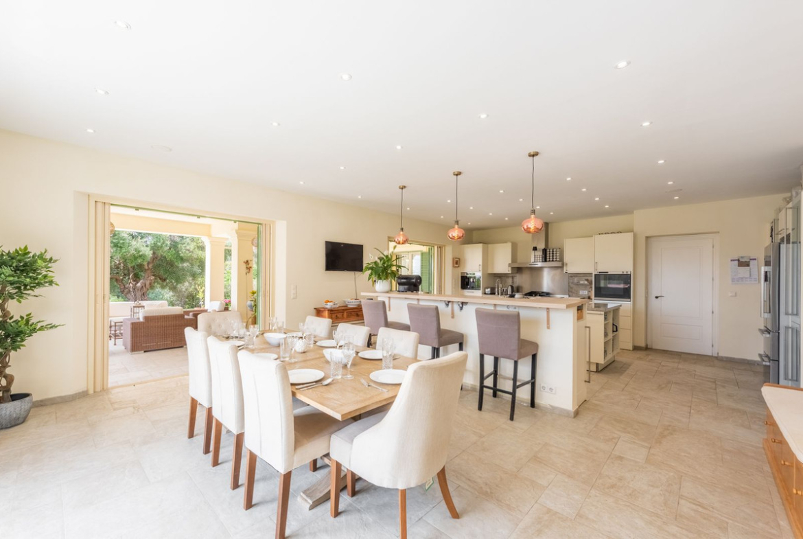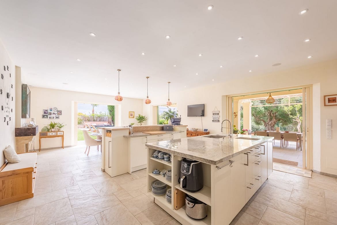 Designed to capture natural light, the villa’s open-plan layout creates a sense of space and freedom. The kitchen flows effortlessly to the covered porch and outdoor dining area, perfect for entertaining or enjoying tranquil evenings under the Sotogrande sky.