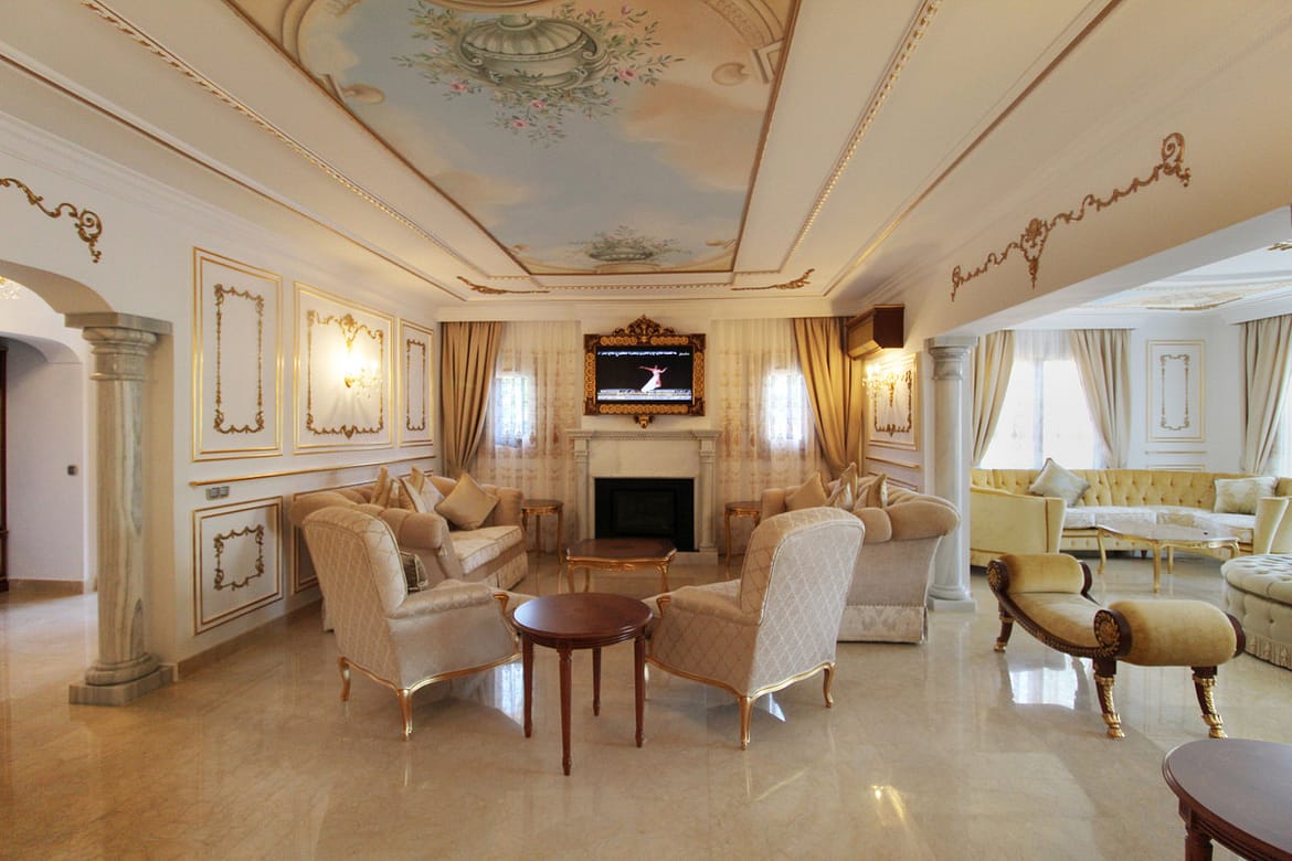 A totally reformed substantial palatial Arabian styled villa which offers eight-bedroom suites which incorporate 2 self-contained suites. The villa has four-meter height impressive double entrance gates and an 81-meter long driveway with parking for numerous cars and is all situated on a huge 4,100 m2 flat plot in Guadalmina Baja and only 322 meters walking distance to a lovely beach and Dantonelas Beach Club. The villa offers good sized rooms throughout which includes the following accommodation, a formal lounge with feature fireplace and concealed plasma TV which is semi open plan to a further large sitting room which has views over the landscaped front garden, from the formal lounge you enter a fabulous formal dining room with table and sitting for 12 people which has very ornate wood and gold paneling to the walls and ceiling. A further traditional Arabic majlis formal lounge with fitted seating and feature central marble fountain with direct access to the large covered rear terrace and overlooking the impressive swimming pool, outside bar, BBQ and sitting areas. Brand new fully fitted L-shaped modern kitchen. There is a generously sized master bedroom suite with a walk-in fully fitted dressing area and fully tiled master ensuite-bathroom. Also, on the ground floor level in the main villa are three further bedroom suites and a maid’s double bedroom/ laundry room off the kitchen. Outside you have one of the self contained apartments which is adjacent to the double garage. Above the garaging area is a very large two double bedroom formal guests apartment which has a fully fitted kitchen with the open plan lounge/dining room and large private upper terrace overlooking the private secluded rear garden and swimming pool area. The villa offers very ornate hand painted wall and ceiling panels in all the main living areas and exceptional handmade bespoke Italian designer furniture throughout. The villa is a one of a kind with stone walling on the exterior and in the traditional Majlis lounge. One has to view to fully appreciate all the fine internal features of this very spacious family home.
