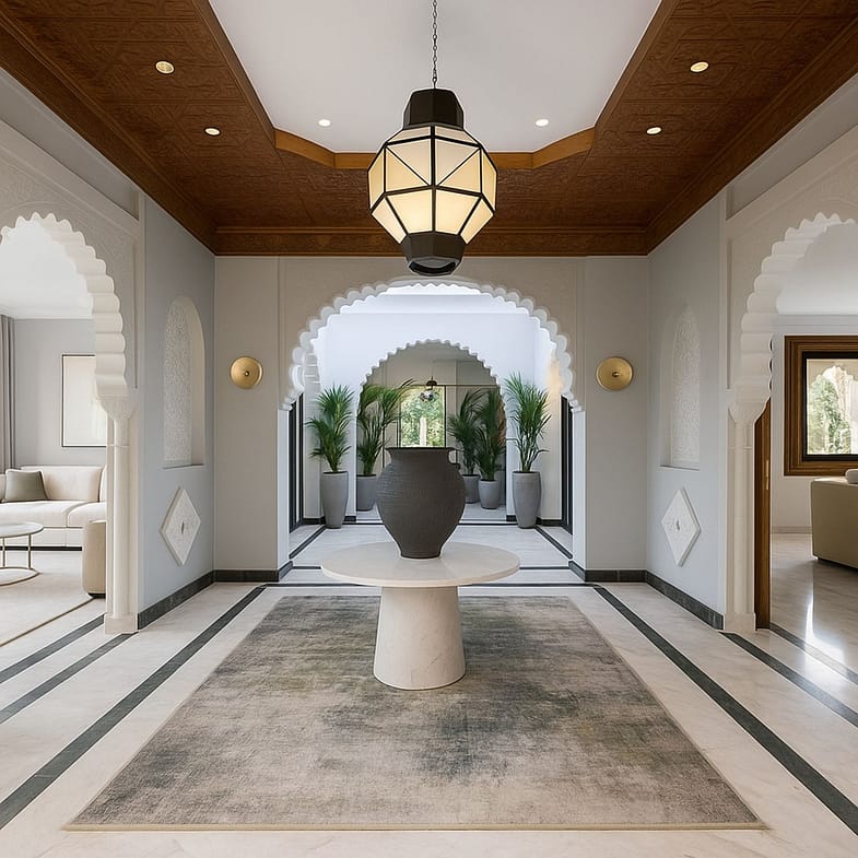 Just 300 meters from the sea, this magnificent villa blends Andalusian Nazarí-modern design, combining luxury and tradition. Its privileged south-facing orientation ensures sunlight throughout the day, illuminating the garden and pool area.