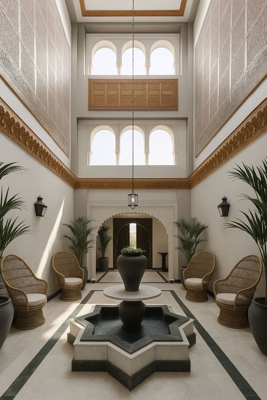 The property is accessed through a grand gate and a driveway. The villa is distributed over 3 floors plus a loft, featuring unique architectural details. Upon arrival, a small staircase leads to the pool and the main porch, offering stunning sea views. The entrance is through an impressive double door, hand-carved in mahogany, leading to a majestic 12-meter-high hall with a central patio and a marble fountain, all bathed in natural light coming through the central tower.