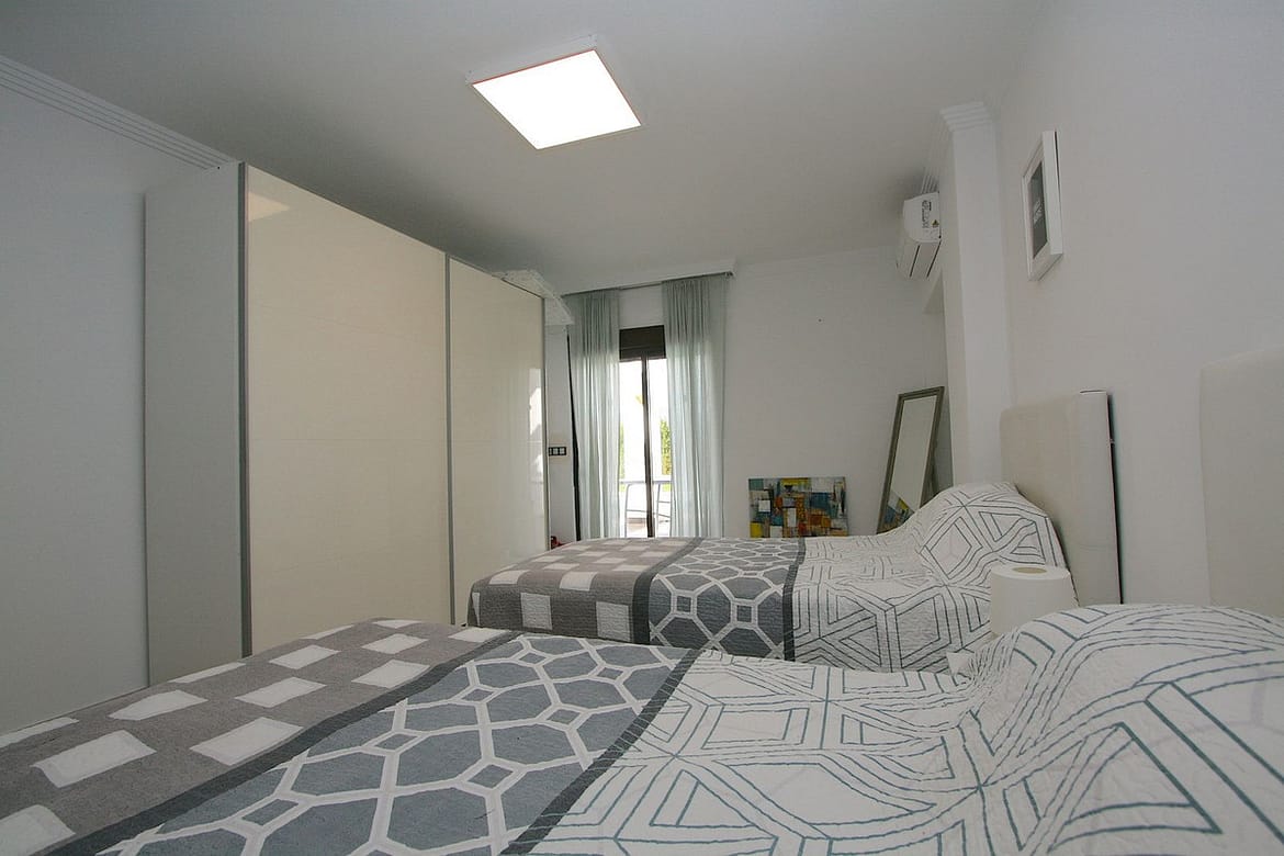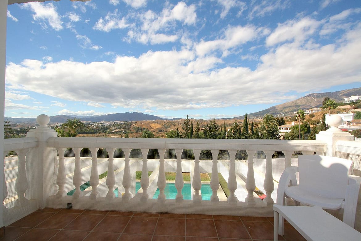 The second floor hosts another elegant master bedroom with magnificent views of the mountains and a private balcony overlooking Mijas Golf. Two additional bedrooms share a good size bathroom. From this level, there is access to a large terrace offering panoramic views across Fuengirola, the sea, and the lush greenery of La Sierrezuela and the magnificent mountains and countryside.