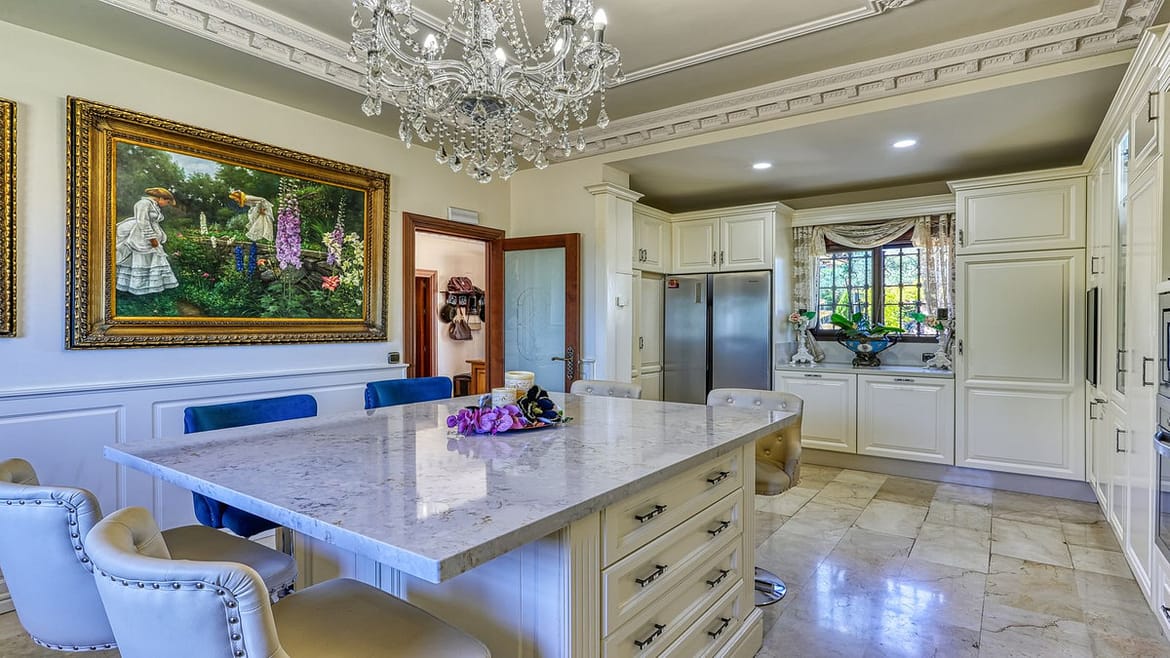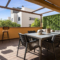 The property’s outdoor spaces include a spacious outdoor kitchen, perfect for al fresco dining, and a variety of outbuildings designed to enhance both lifestyle and functionality. These include two independent garages, a studio with a kitchen and bathroom, additional storage rooms, and a stable. A carport provides further covered parking for two vehicles.