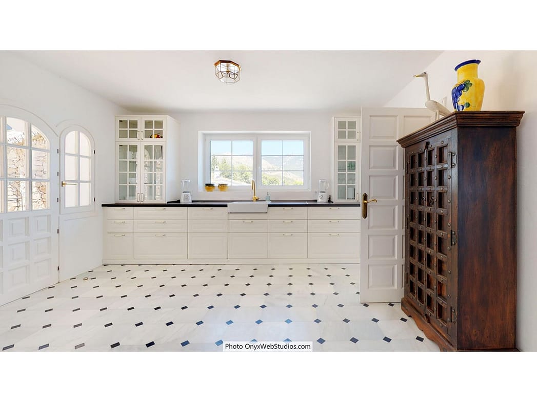On entrance level there is a large kitchen with separate entrance. Upper floor consists of a big master bedroom with terrace, dressing-room, a further bedroom and 2 bathrooms. Beside the lounge there is further 2 bedrooms, one with bathroom en-suite, 1 more bathroom and a small room for dressing/office.