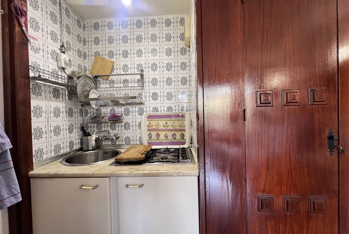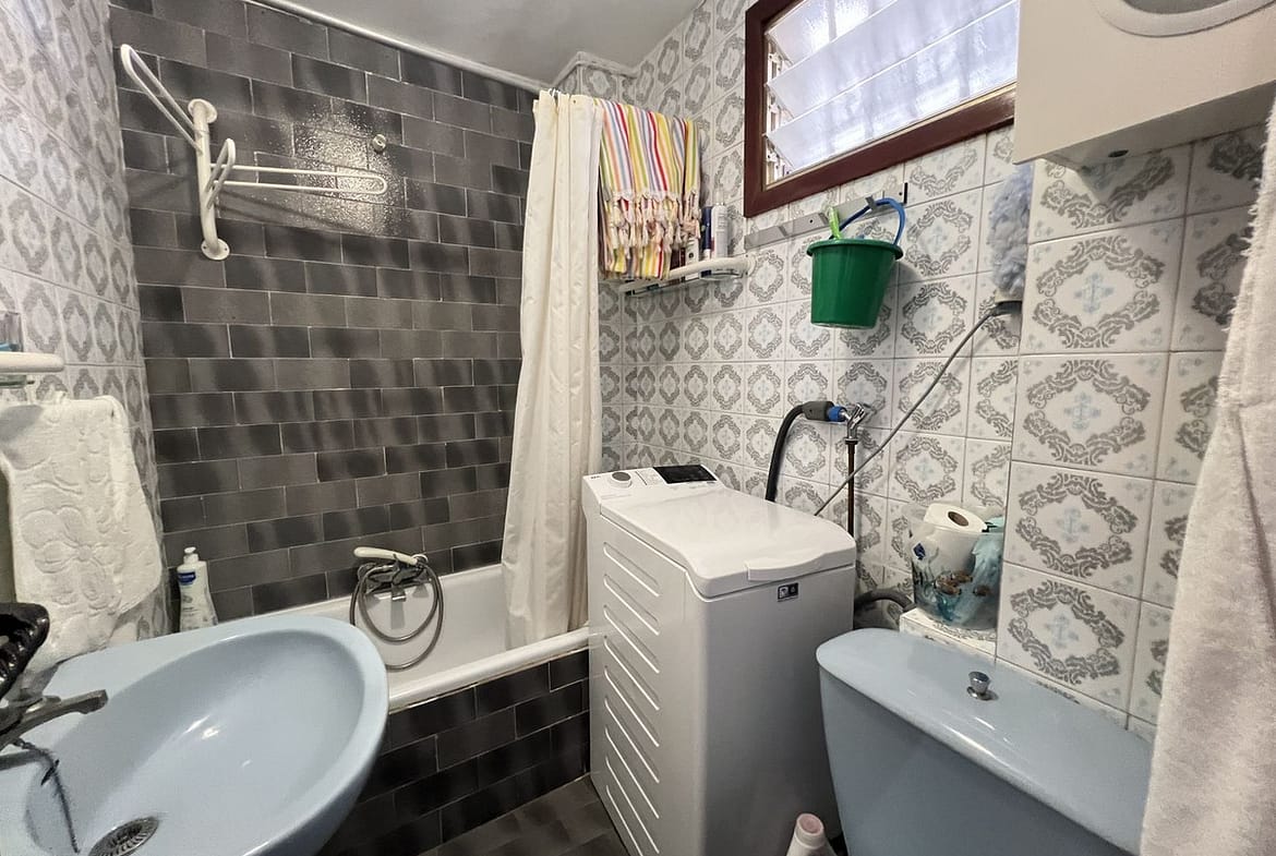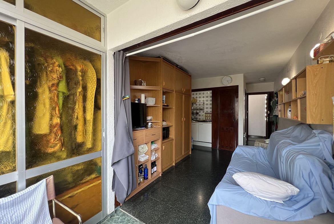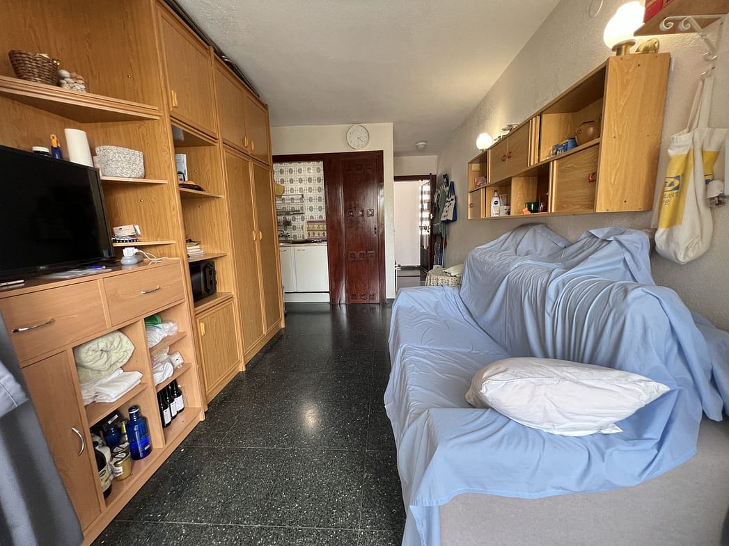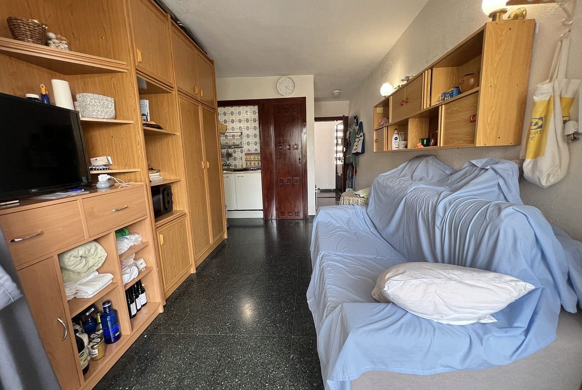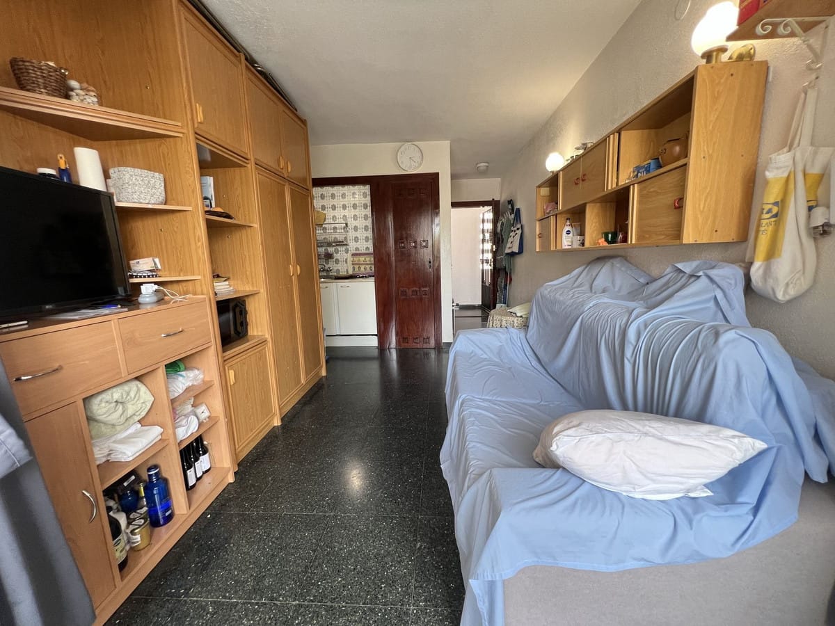 Upon entering, you’re welcomed by a full bathroom with a bathtub. Then, a cozy and functional space includes a fully equipped kitchen, a sofa bed, a bunk wardrobe, and access to a pleasant terrace overlooking the pool with a partial sea view. The southeast orientation ensures plenty of natural light throughout the day. It also has a large closet on the terrace and a small pantry in the kitchen.