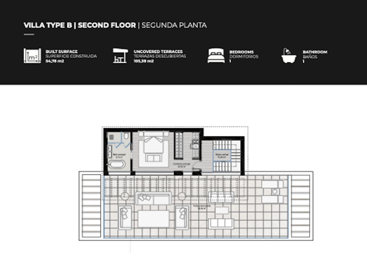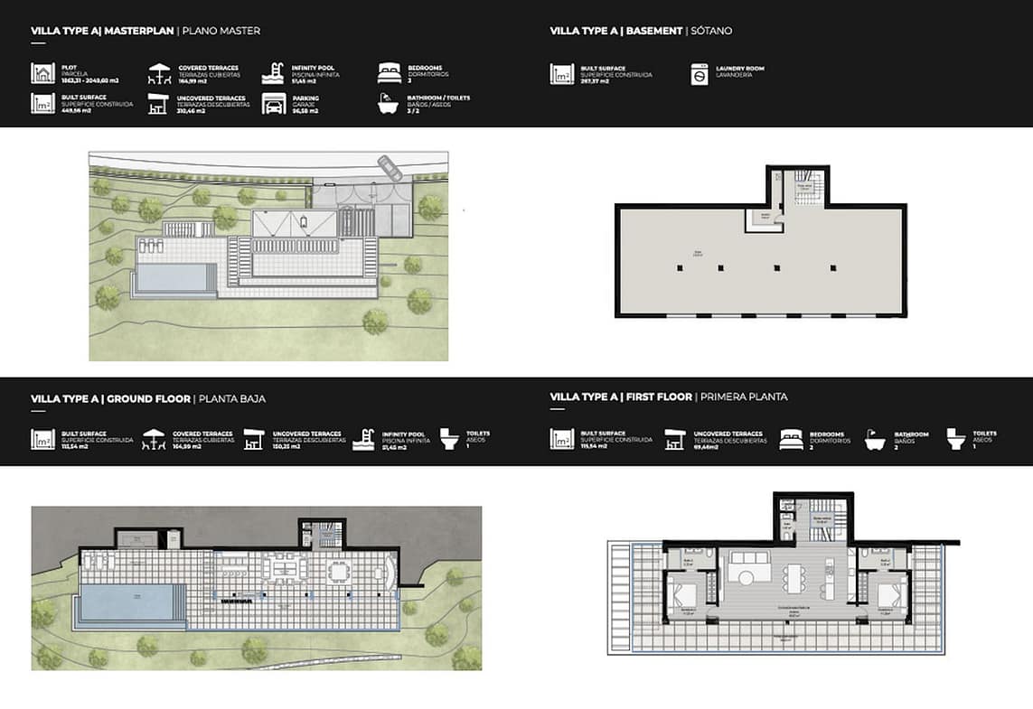 The original design offers a total build size of 440m2, of which covered terraces are 164m2, uncovered terraces 310m2, a pool of 51m2, a garage of 45m2 iand nterior built surface. of 258m2