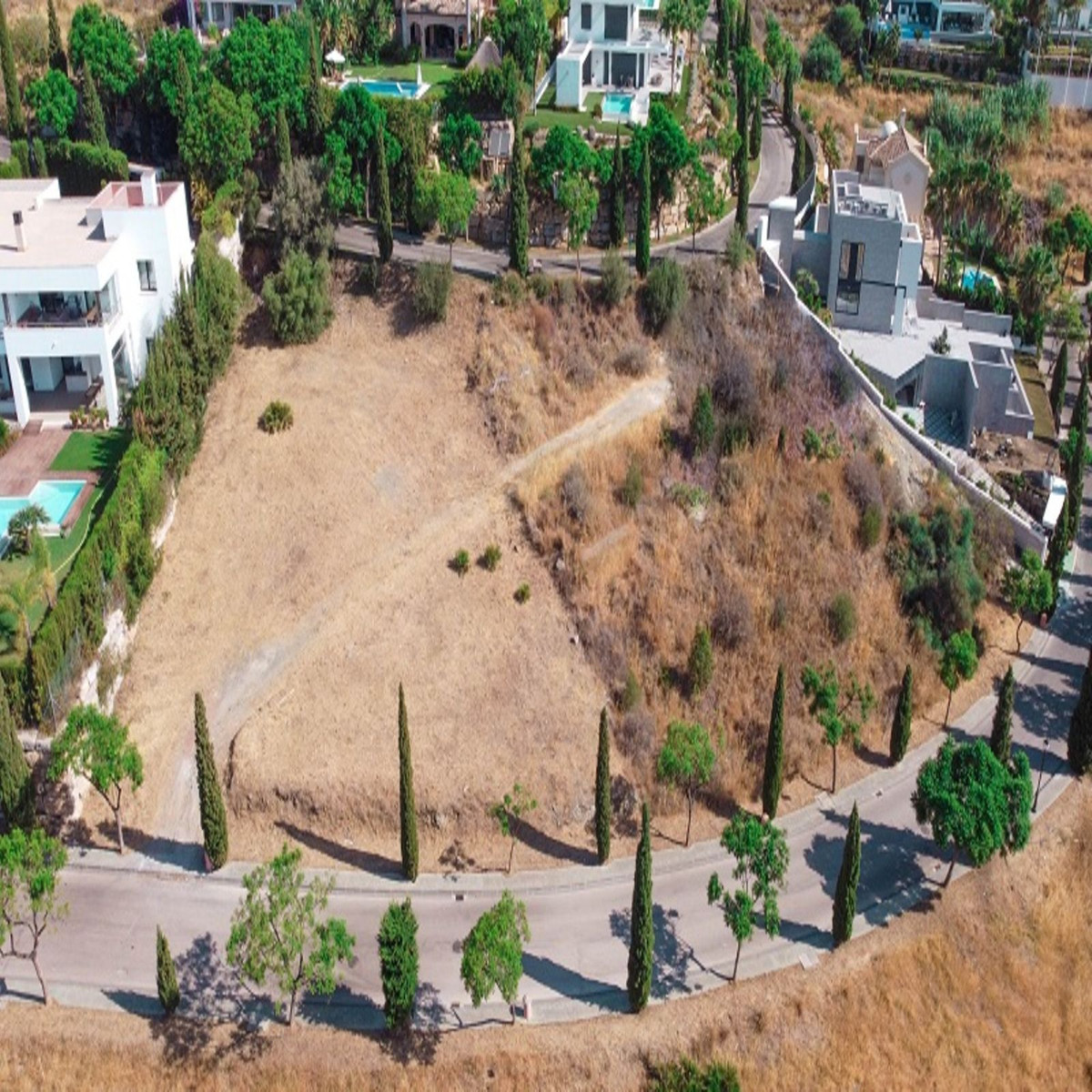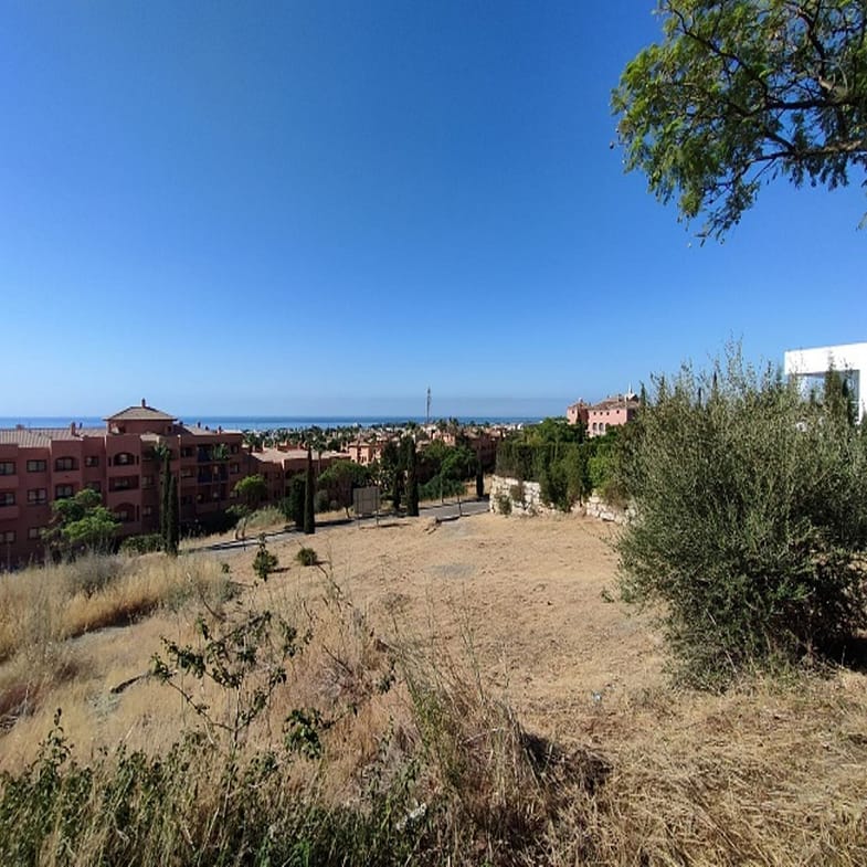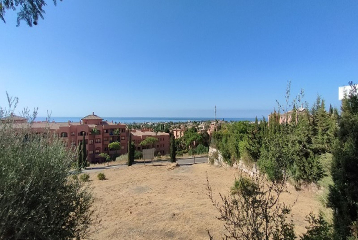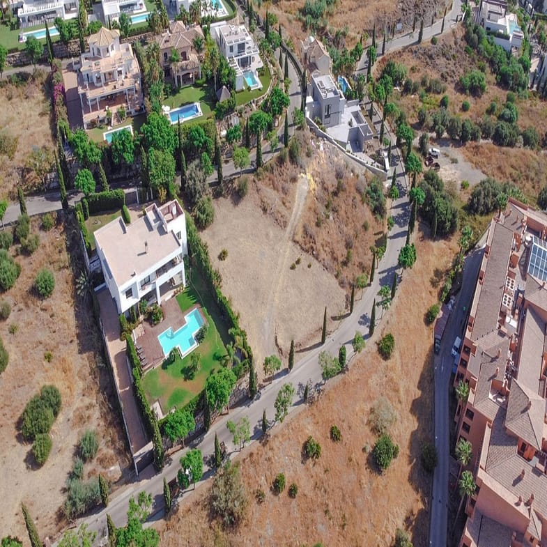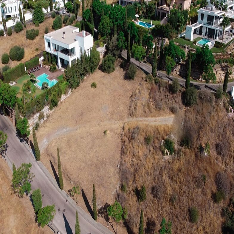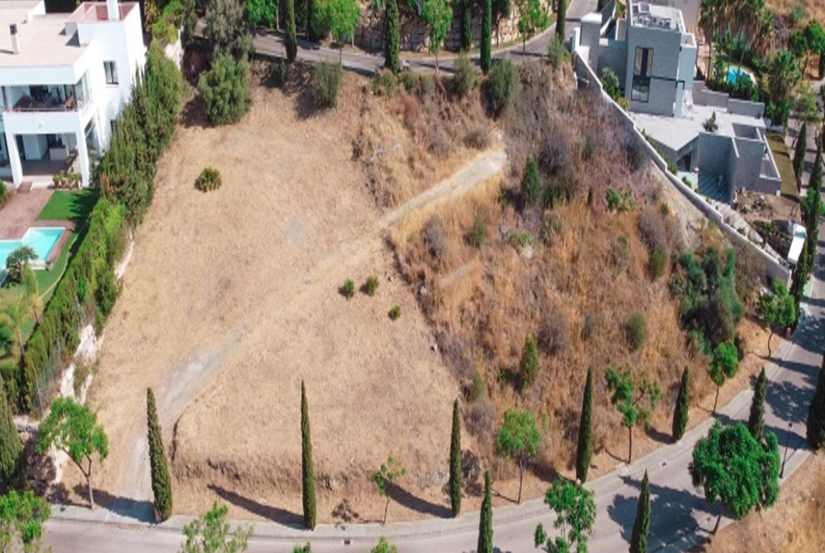 Benahavis, Flamengos urbanization, Plot WITH SEA VIEWS in one of the most luxurious private developments on the Costa del Sol. It has only a slight slope (10 meters) of its 66 meters in length, making it the best-located plot in the entire development. 370 m2 can be built above ground. The price is set to sell now; the appraisal is much higher. The condition of the plot allows for construction at normal prices, meaning without steep slopes, making the construction cost considerably more economical. The surrounding houses are modern, contemporary mansions.
