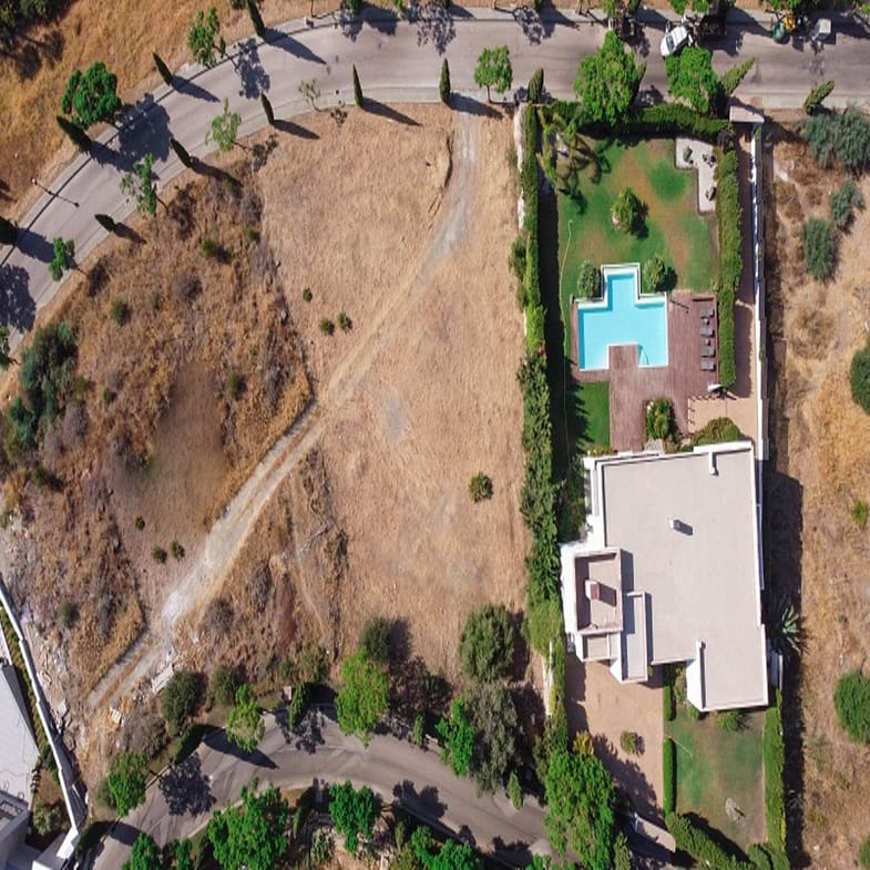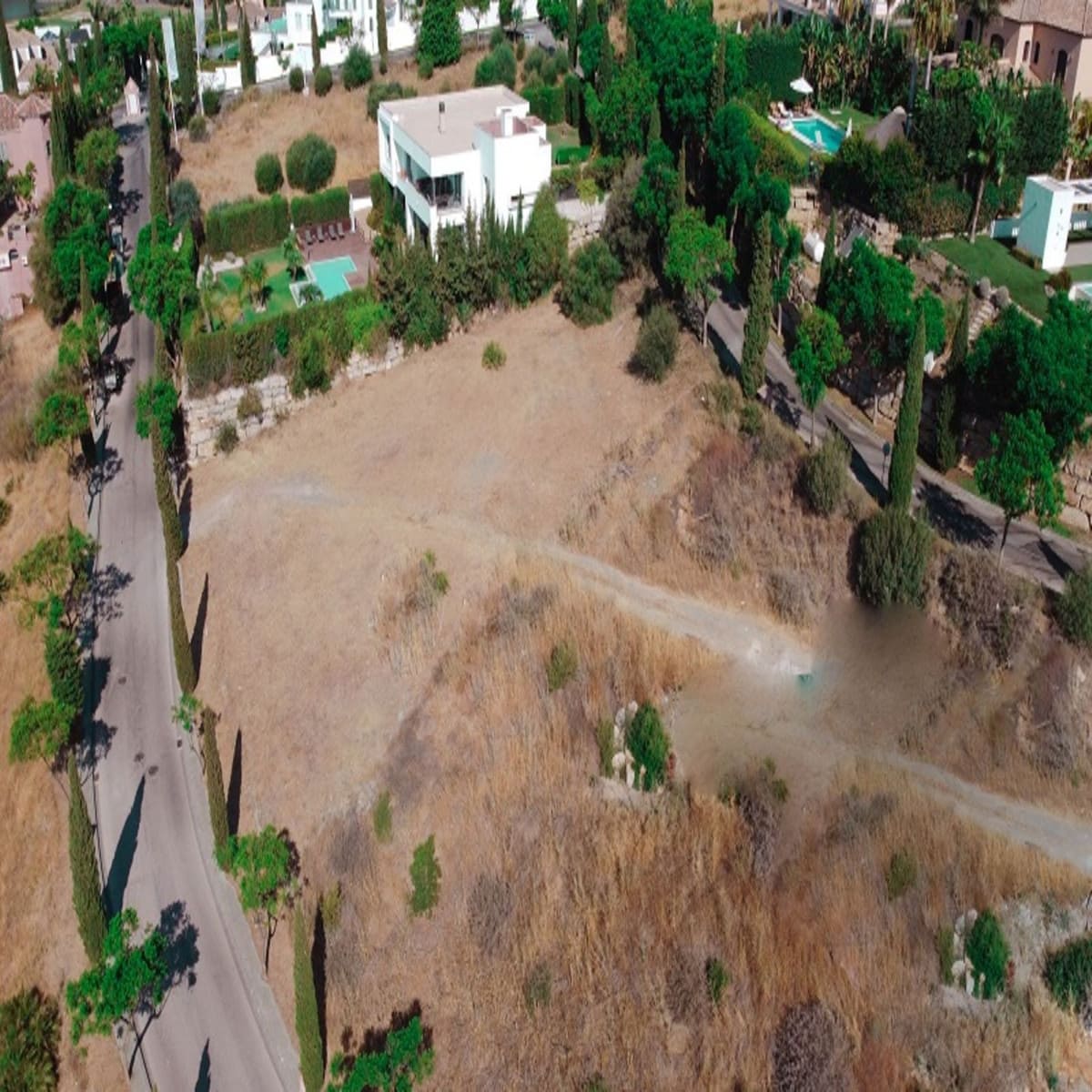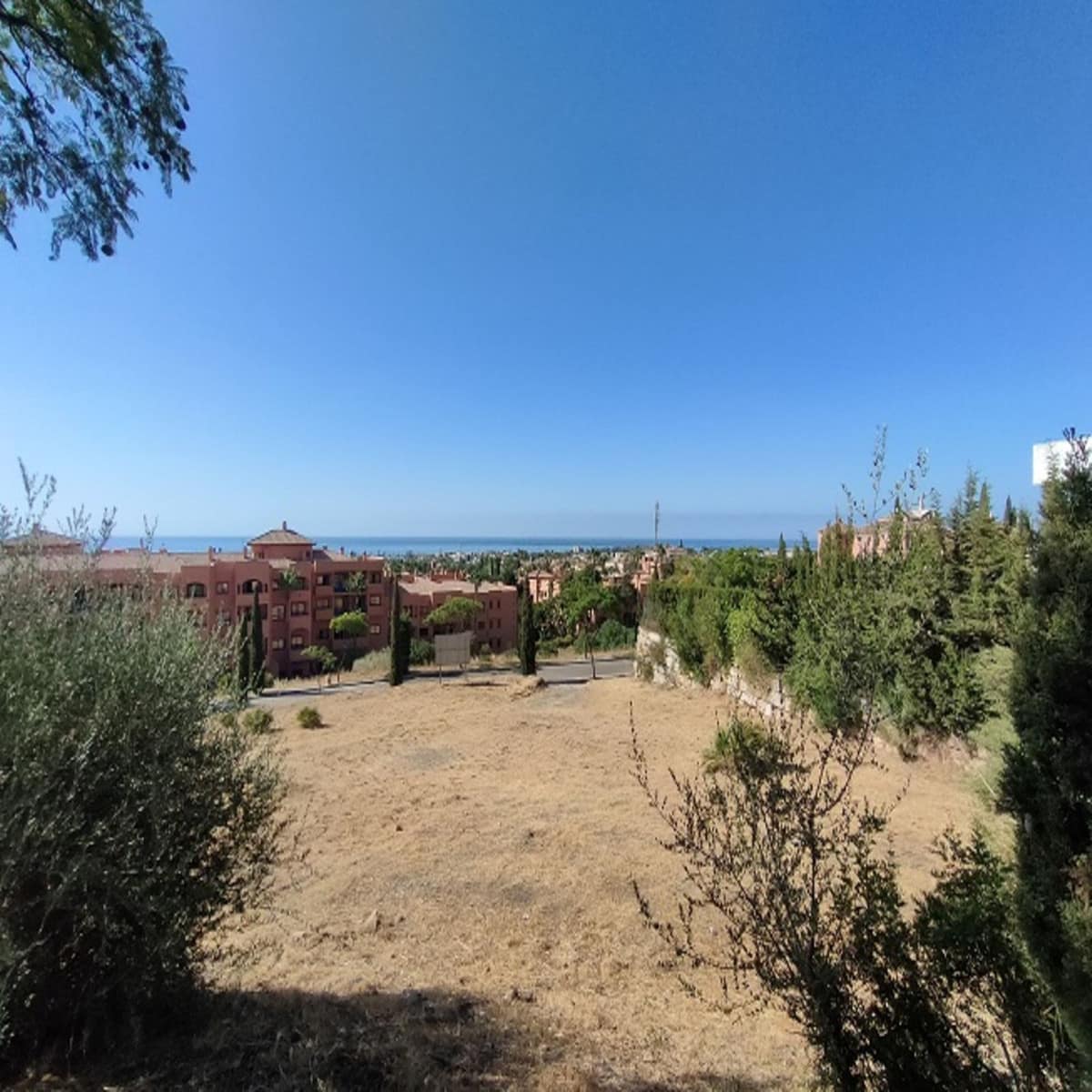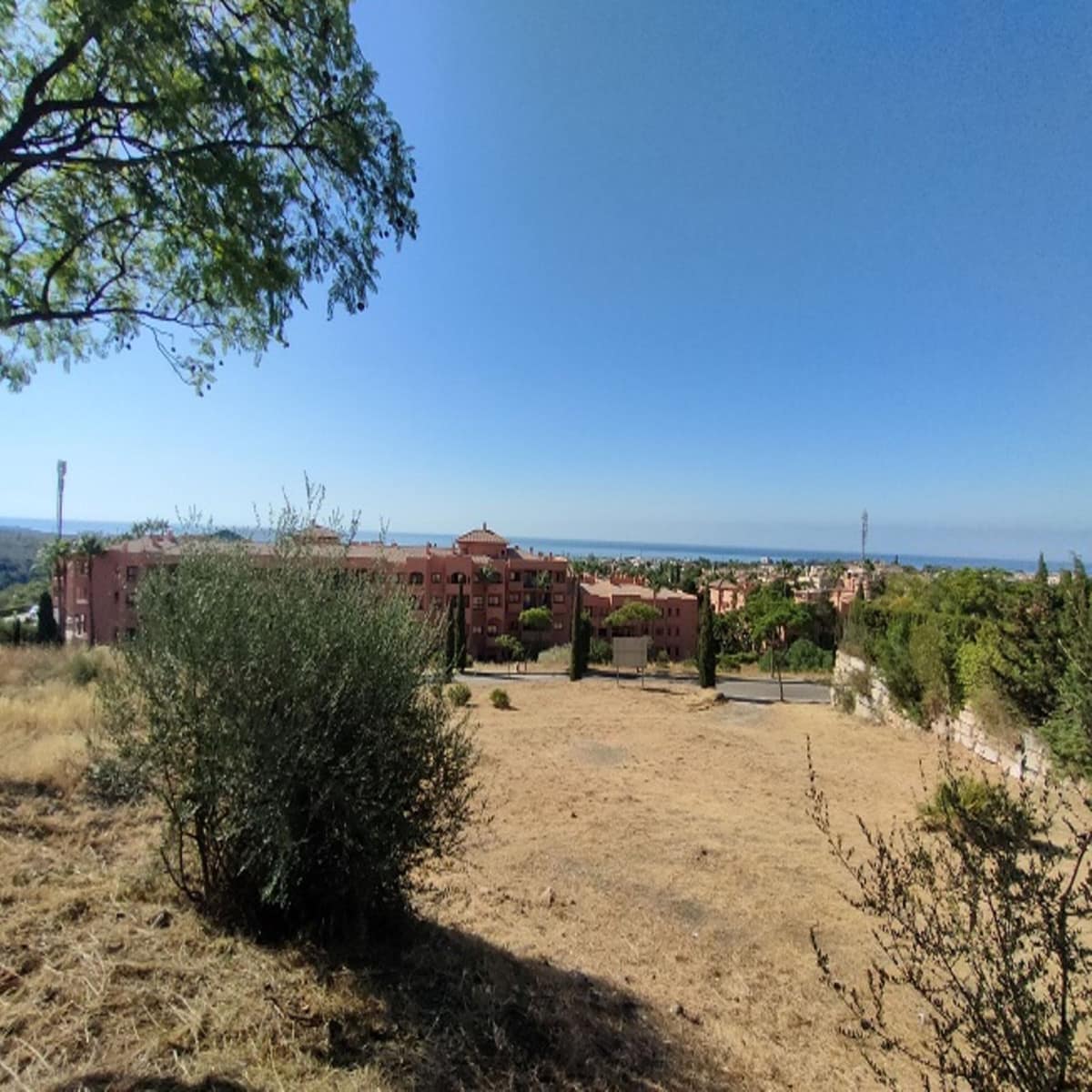 Benahavis, Flamengos urbanization, Plot WITH SEA VIEWS in one of the most luxurious private developments on the Costa del Sol. It has only a slight slope (10 meters) of its 66 meters in length, making it the best-located plot in the entire development. 370 m2 can be built above ground. The price is set to sell now; the appraisal is much higher. The condition of the plot allows for construction at normal prices, meaning without steep slopes, making the construction cost considerably more economical. The surrounding houses are modern, contemporary mansions.