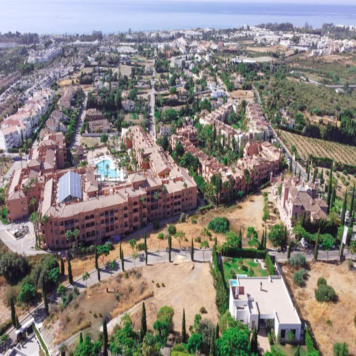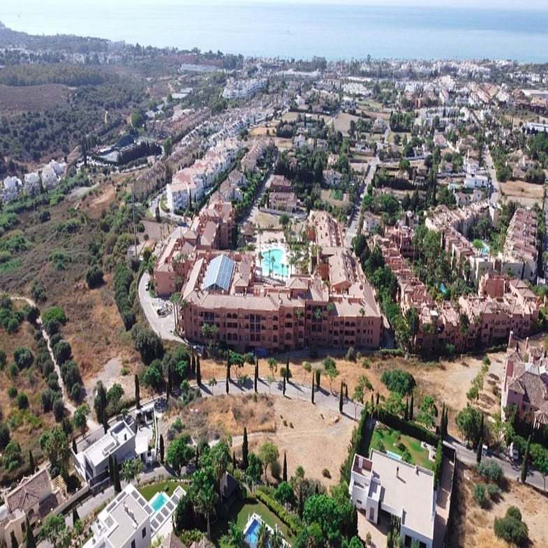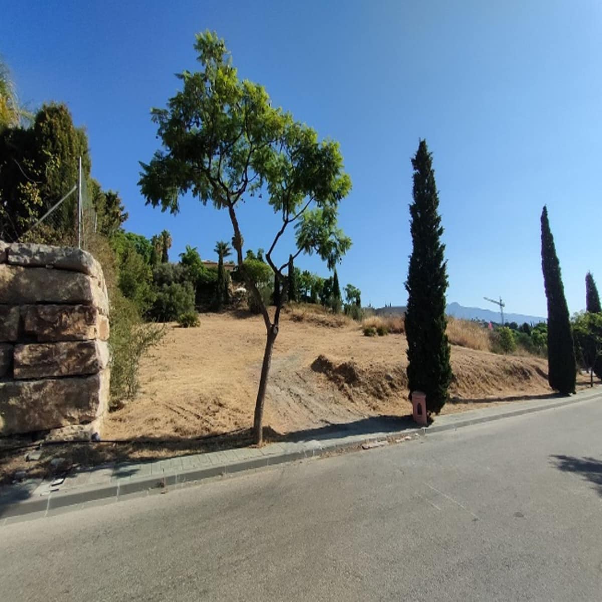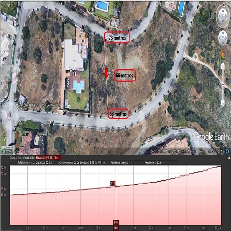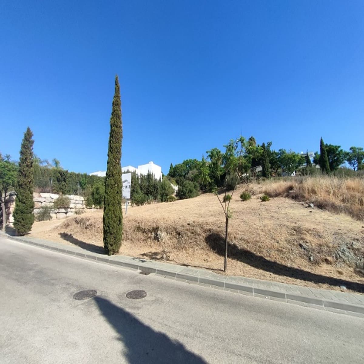 Benahavis, Flamengos urbanization, Plot WITH SEA VIEWS in one of the most luxurious private developments on the Costa del Sol. It has only a slight slope (10 meters) of its 66 meters in length, making it the best-located plot in the entire development. 370 m2 can be built above ground. The price is set to sell now; the appraisal is much higher. The condition of the plot allows for construction at normal prices, meaning without steep slopes, making the construction cost considerably more economical. The surrounding houses are modern, contemporary mansions.